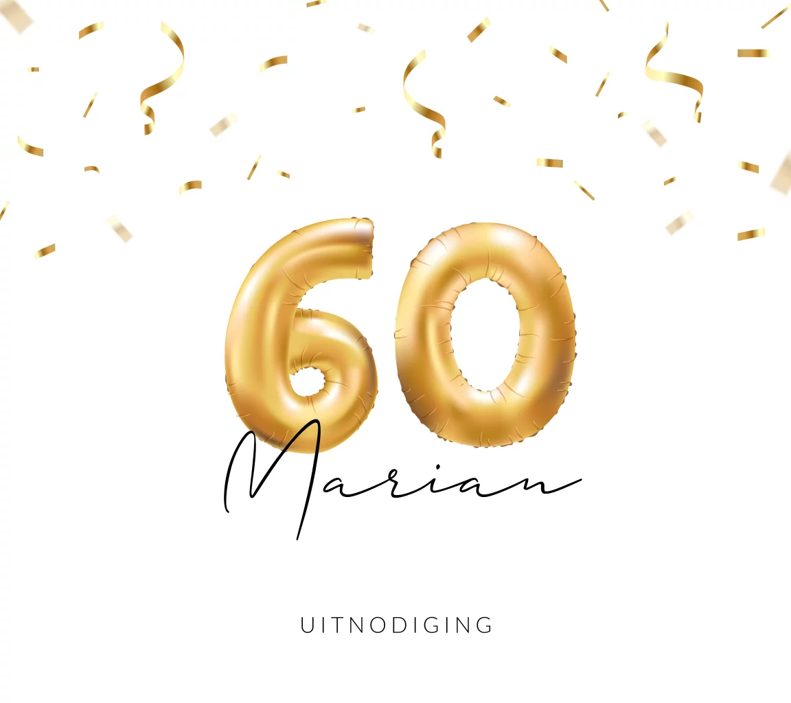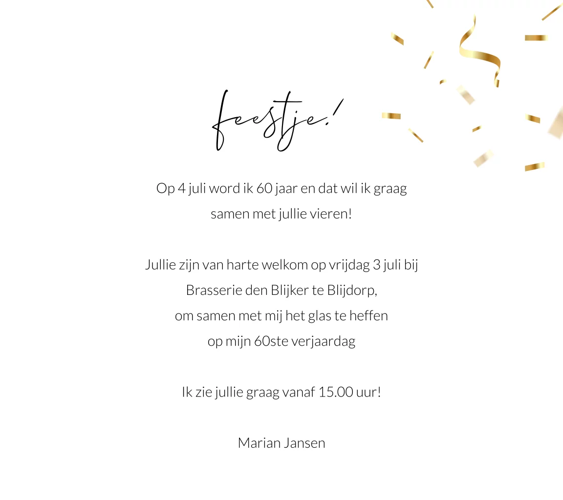 Sierlijke uitnodiging voor een 60 jarige. Deze verjaardagskaart met goudkleurige confetti en het gouden cijfer 60 is geschikt voor een dame en voor een heer. De gouden elementen zijn geen folie, maar afbeeldingen.