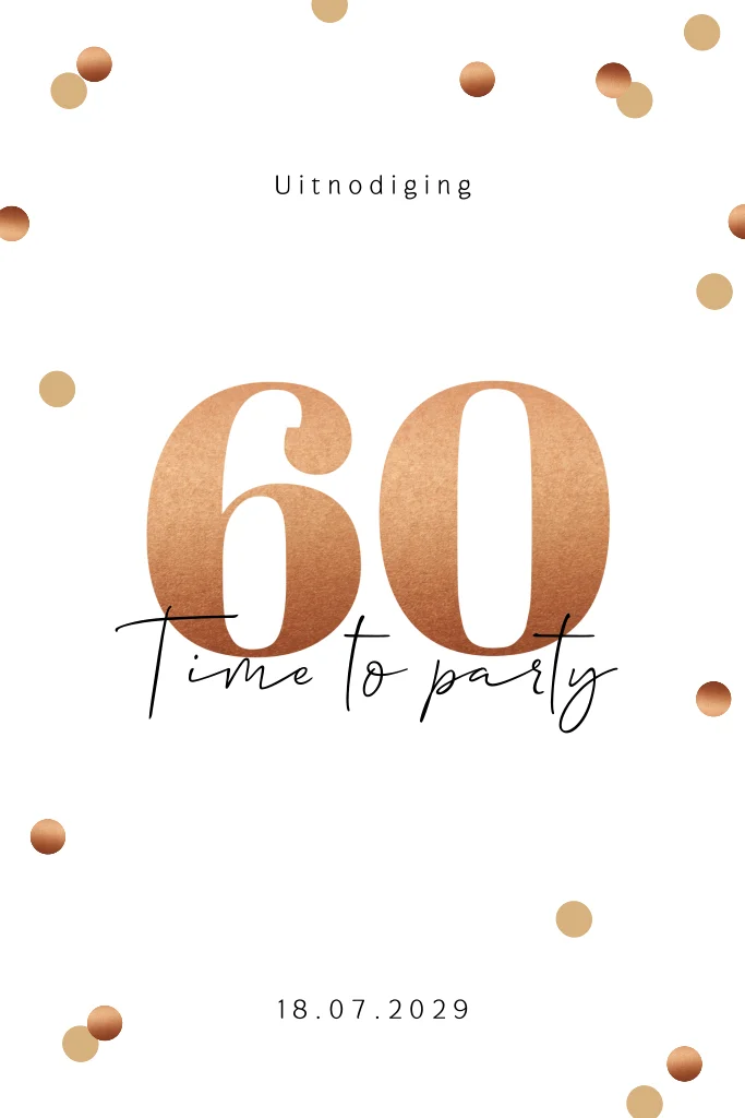 Stijlvolle uitnodiging voor een verjaardag met het getal zestig in een mooie kopergloed. De kaart is verder wit met gouden en koperkleurige confetti. Een feestelijke kaart met de toepasselijke tekst 'time to party'. Geen 60 jaar maar een andere leeftijd? Alles is eenvoudig aan te passen. Lukt het niet? Neem dan contact met ons op. Wij helpen je graag!