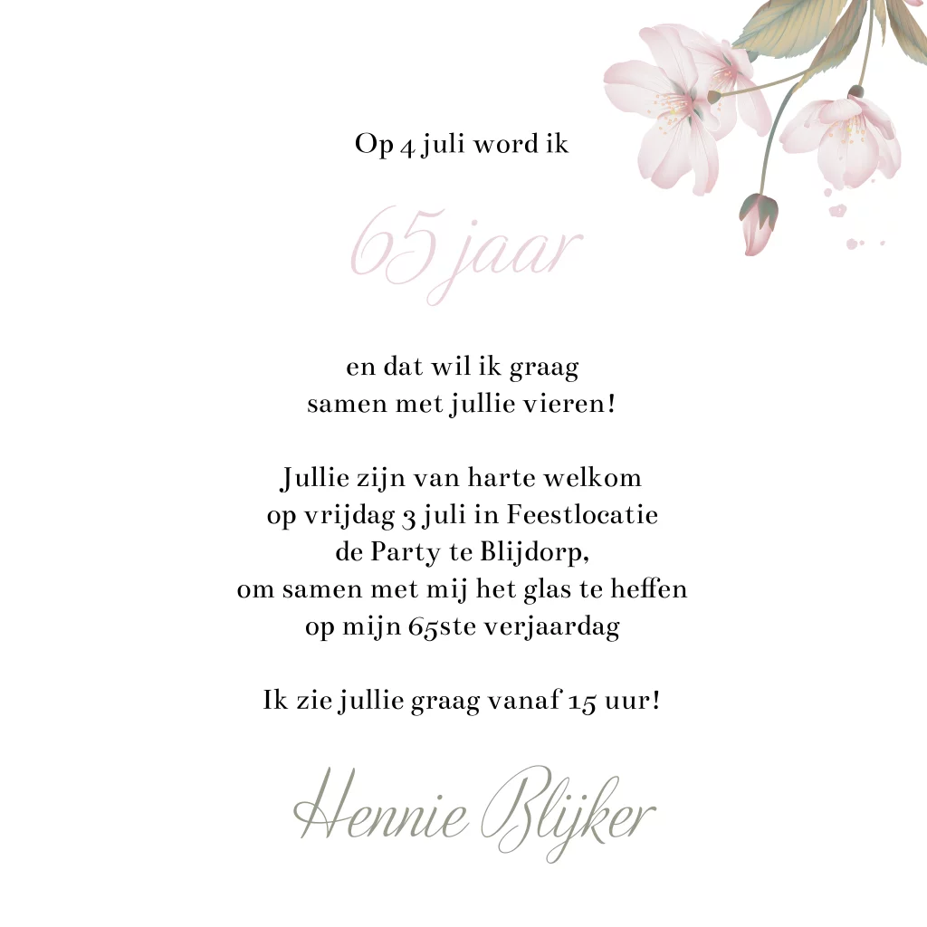 Bloemen met bloesem uitnodiging 65 jaar