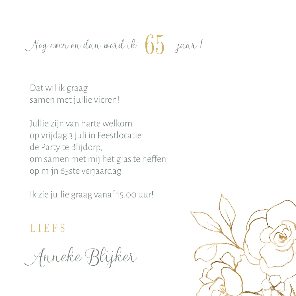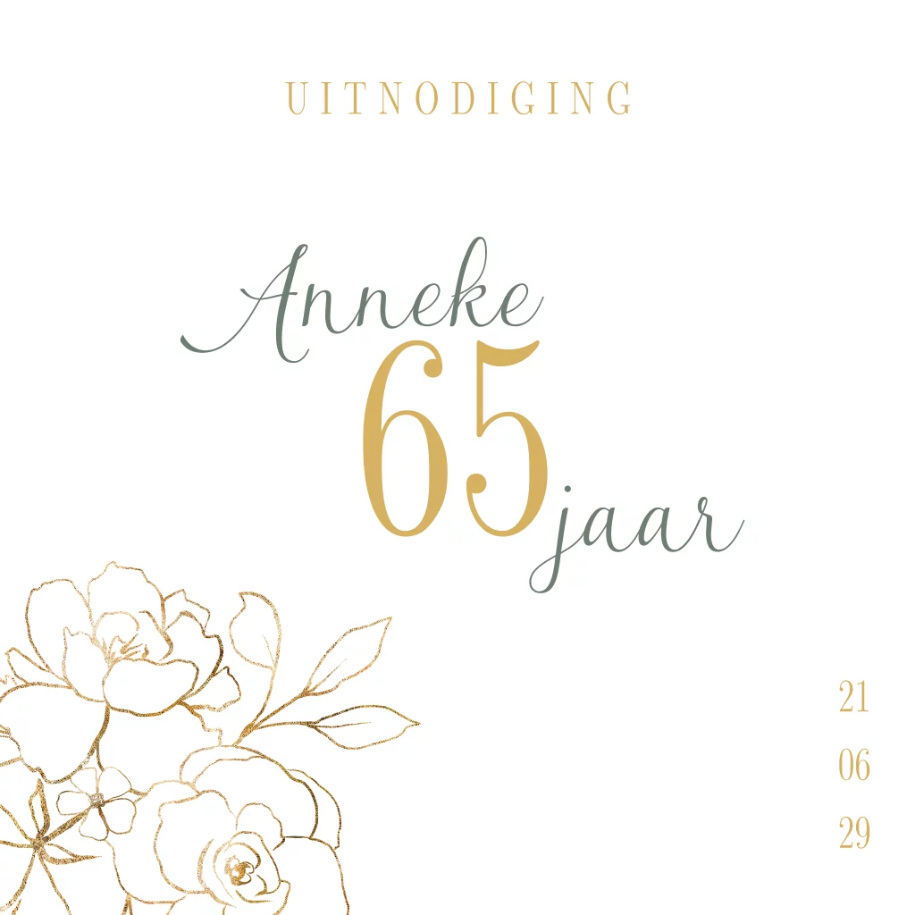 Basic uitnodigingskaart met sierlijke bloemen in goudkleur. Deze kaart heeft een rustige en romantische uitstraling. Pas de kaart naar wens aan in onze editor. Op deze verjaardagskaart staat 65 jaar, maar natuurlijk ook als basis kaart te gebruiken voor een andere leeftijd.