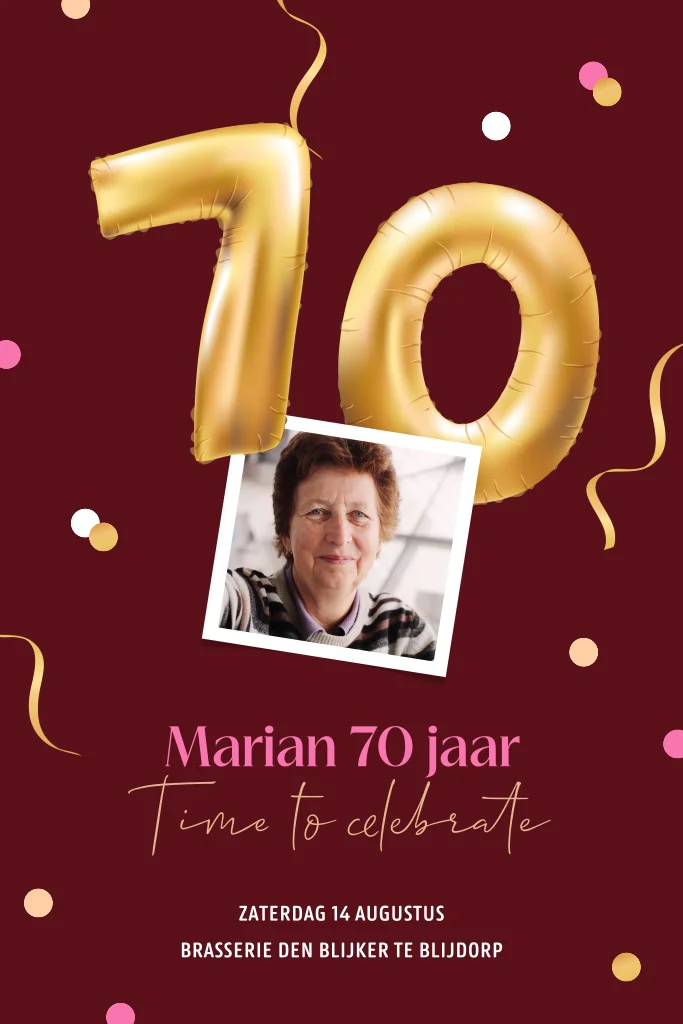 Feestelijke uitnodiging 70 jaar met confetti, ballon en foto