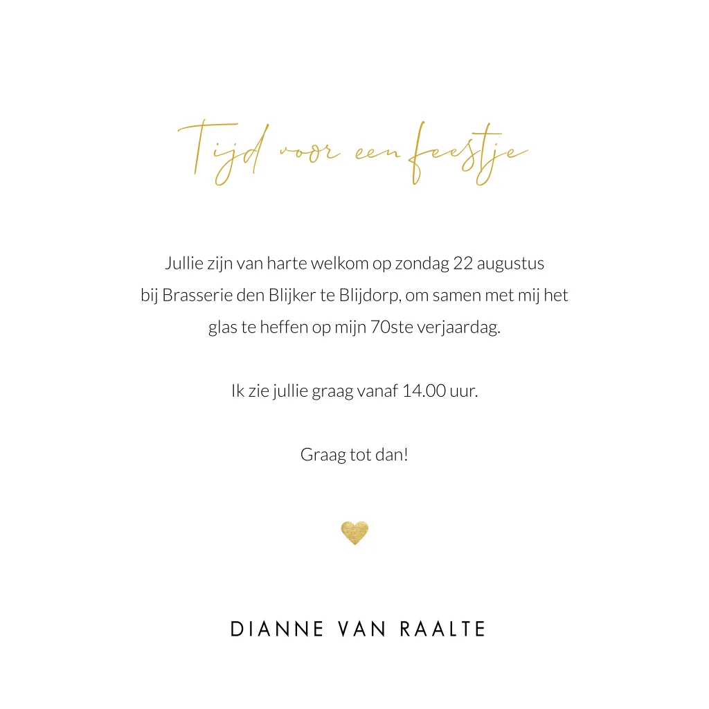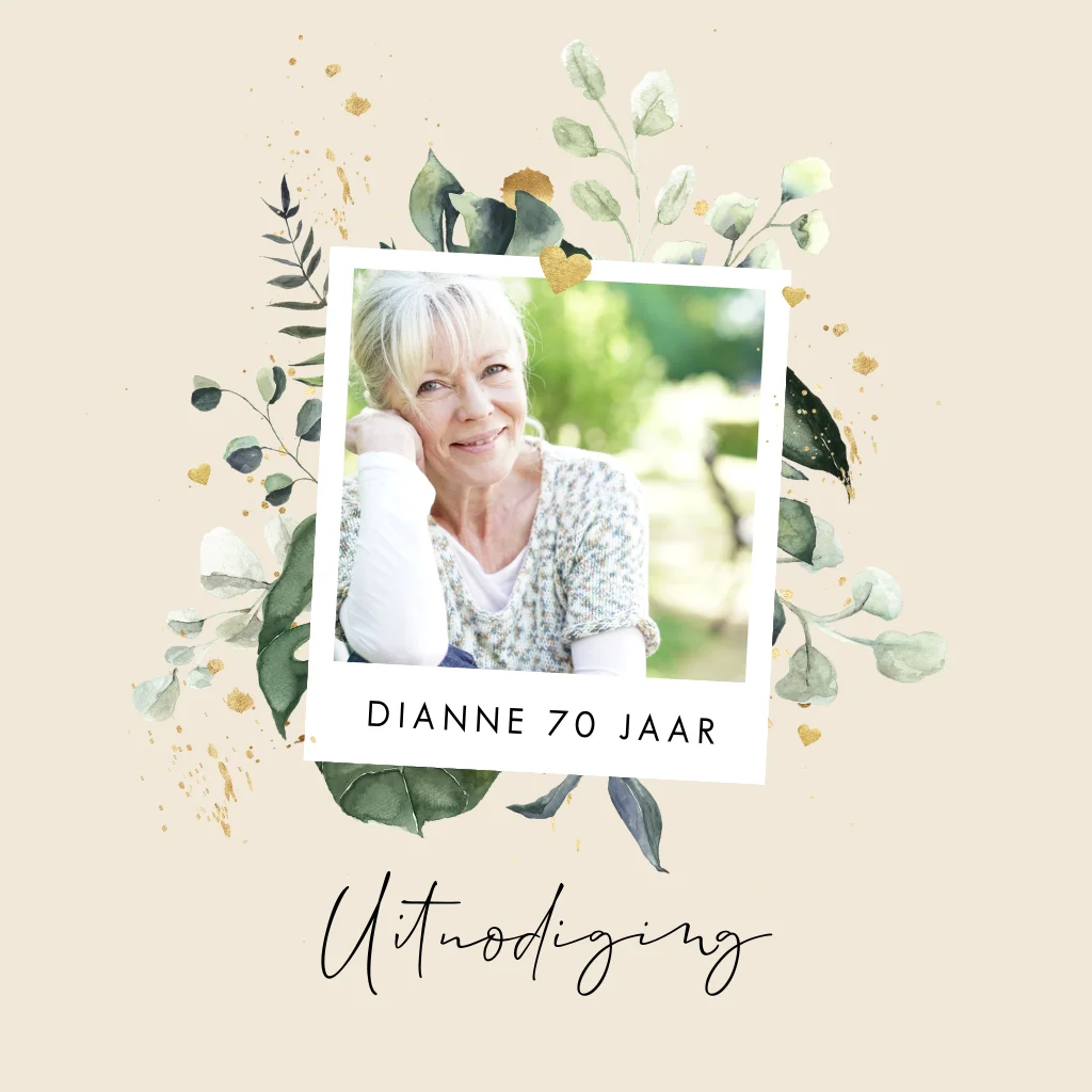 Bloemen uitnodiging voor de verjaardag van een 70 jarige. Op deze kaart plaats je eenvoudig je eigen foto. Deze staat in een kader en er achter staan fraaie bloemen. De gouden spetters en hartjes maken het extra feestelijk. Vragen of hulp nodig? We staan voor je klaar en helpen je graag.