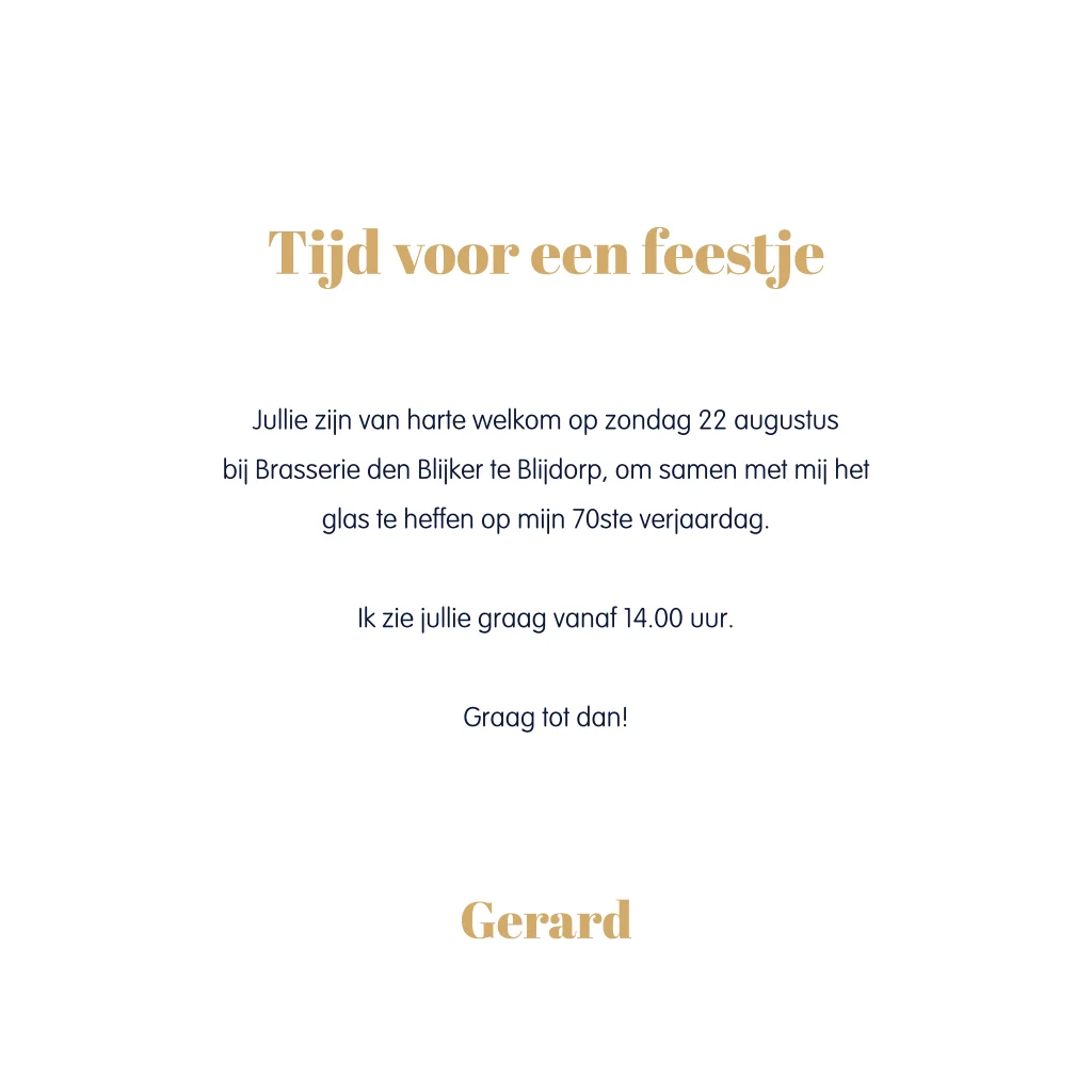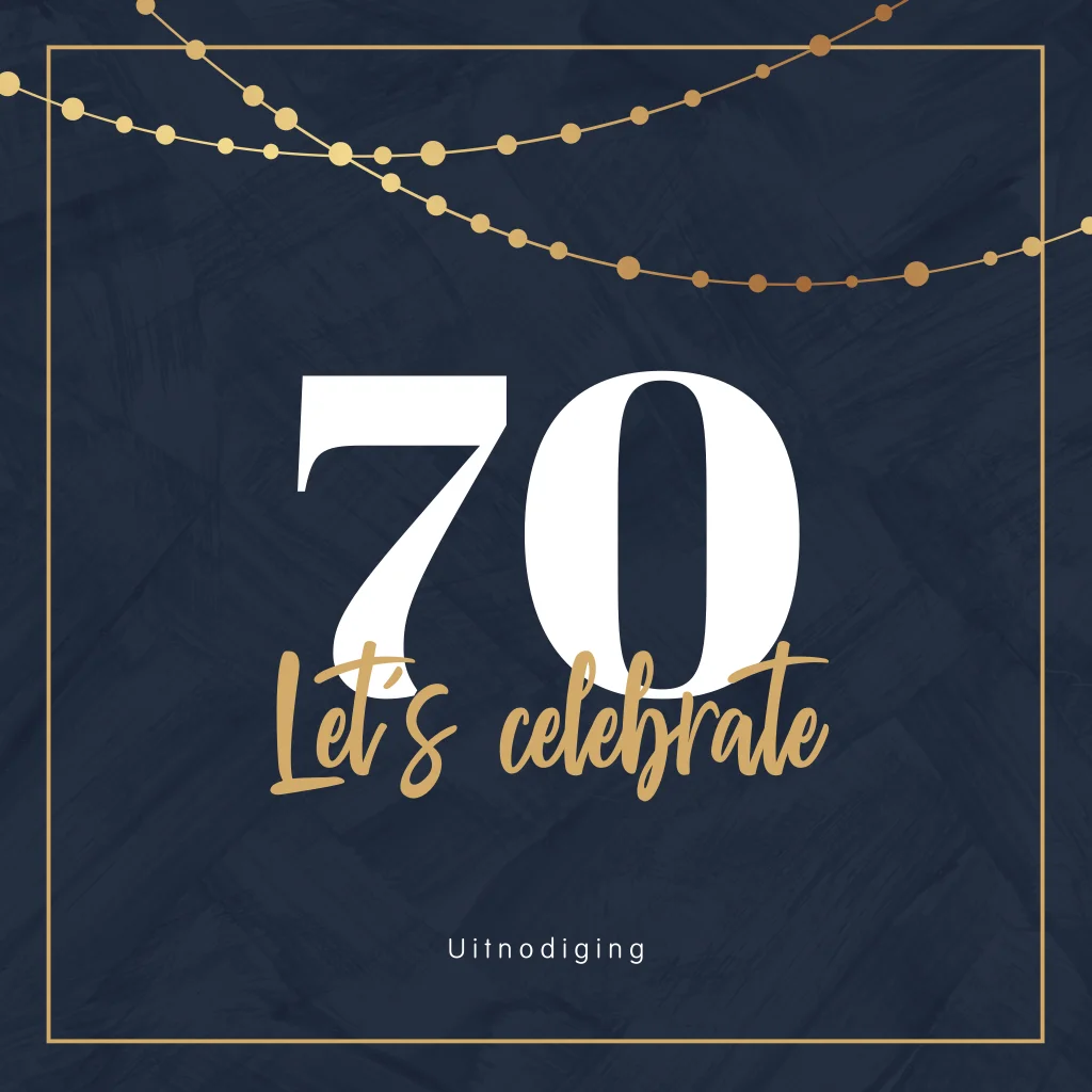 Stijlvolle verjaardag uitnodiging voor 70 jaar. Deze uitnodiging heeft een mooie donkerblauwe achtergrond met goudlook kader en slinger. In wit staat het cijfer 70 met in goudlook letters 'Let's celebrate'. De kleurencombinatie pas perfect bij elkaar en de goudlook geeft een stijlvolle uitstraling.