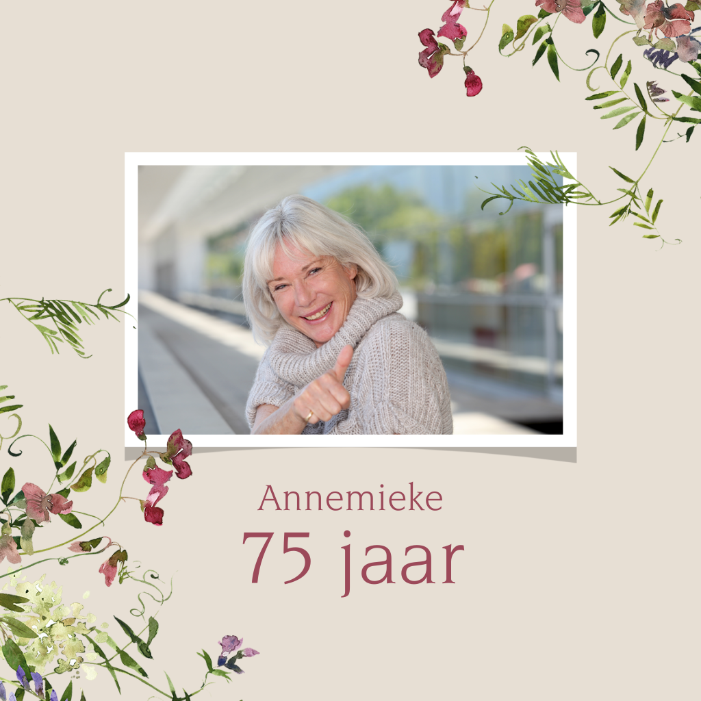75 jaar alweer: alle reden voor een feestje! Stuur je gasten deze verjaardagsuitnodiging met jouw eigen foto erop. In de hoeken van de kaart fleurige bloemen.