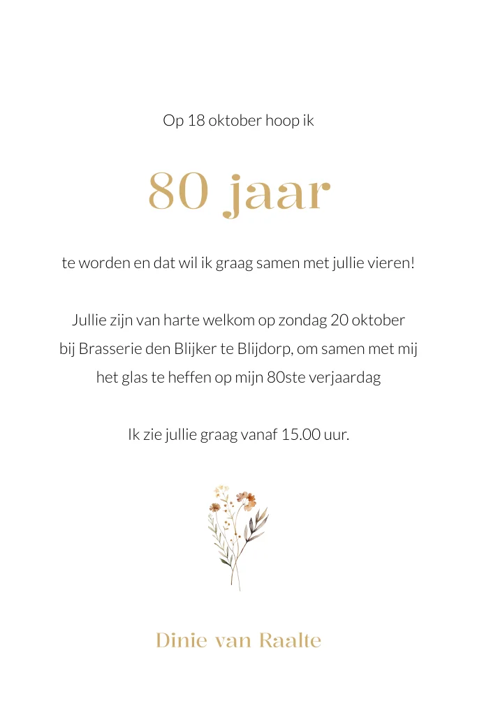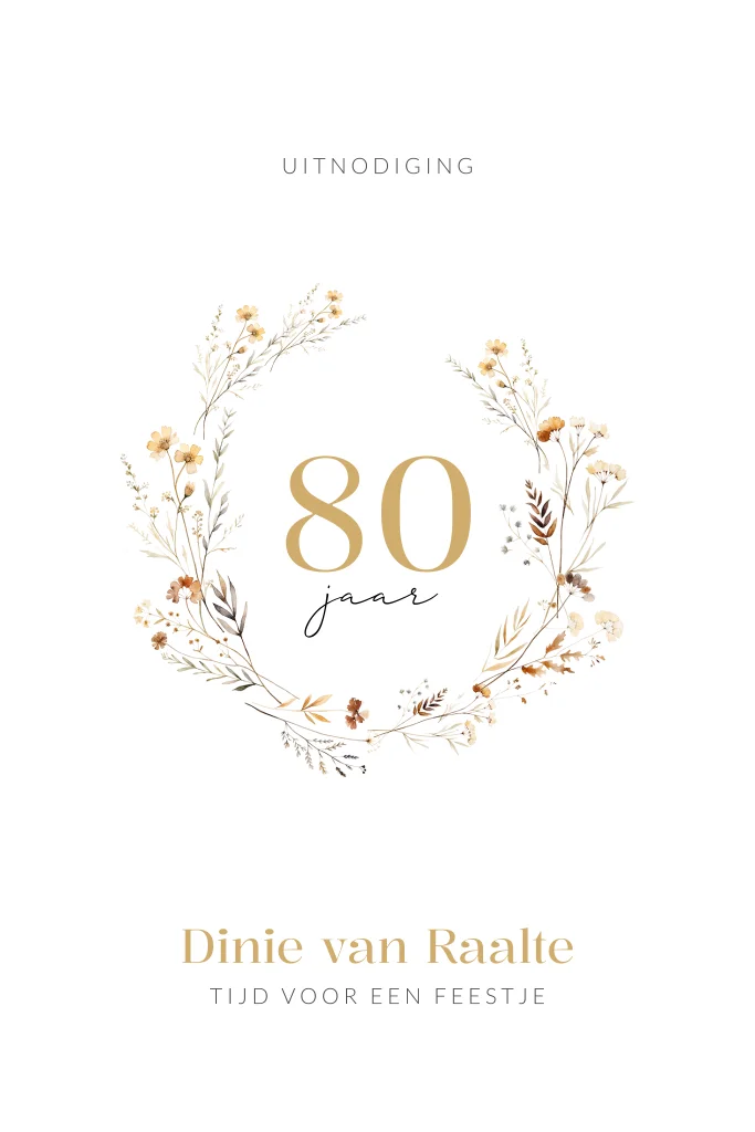 Mooie uitnodiging voor een 80 jarige. Deze verjaardagskaart heeft een bloemenkrans met naturel tinten. Teksten, kleuren en de lettertypes zijn aan te passen in de editor.