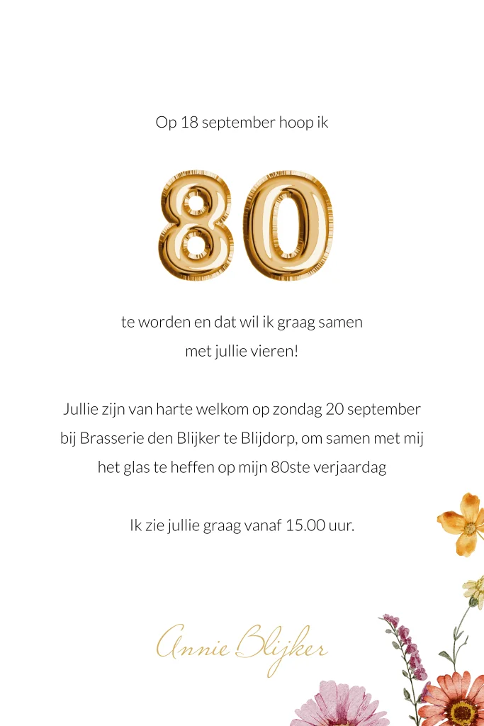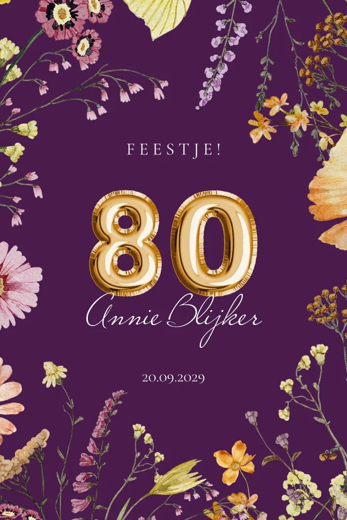 Fleurige uitnodiging voor een 80 jarige. Deze verjaardagskaart heeft veldbloemen in diverse kleuren. Pas de kaart eenvoudig aan in onze editor.