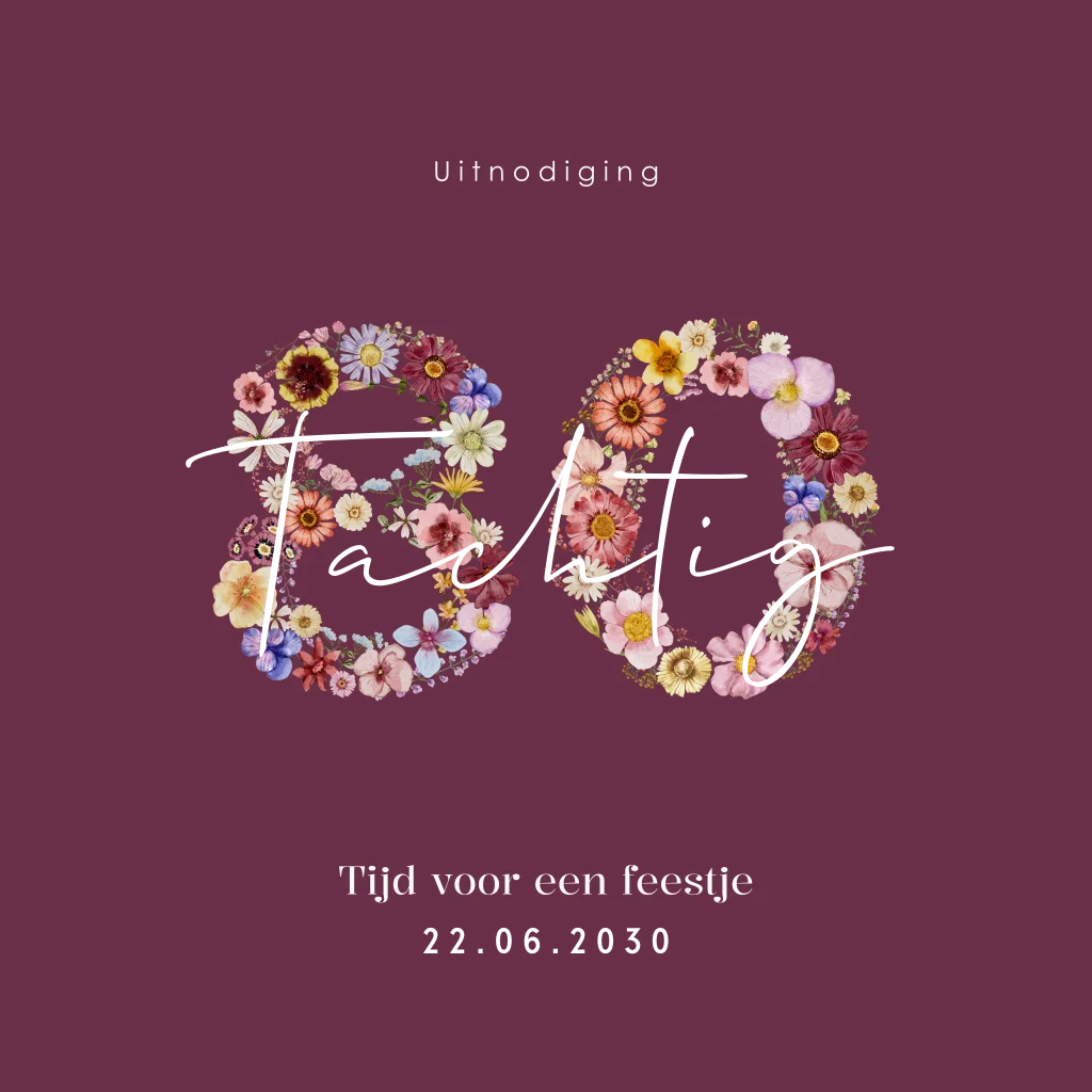Stijlvolle verjaardag uitnodiging om te vieren dat je 80 jaar wordt of bent geworden. Deze uitnodiging heeft een mooie rood paarse achtergrond met bloemen in het cijfer 80 met daarvoor in goudfolie het woord 'tachtig'. Een chique en toch ook vrolijke uitnodiging voor een 80-jarig verjaardagsfeest. Je kunt deze uitnodiging zelf gemakkelijk bewerken, opslaan en bestellen. Extra handig: Laat je uitnodigingen voor je verjaardagsfeest met onze verzendservice direct vanaf de drukkerij versturen. Vragen of wensen? Laat het gerust weten, wij helpen je graag.