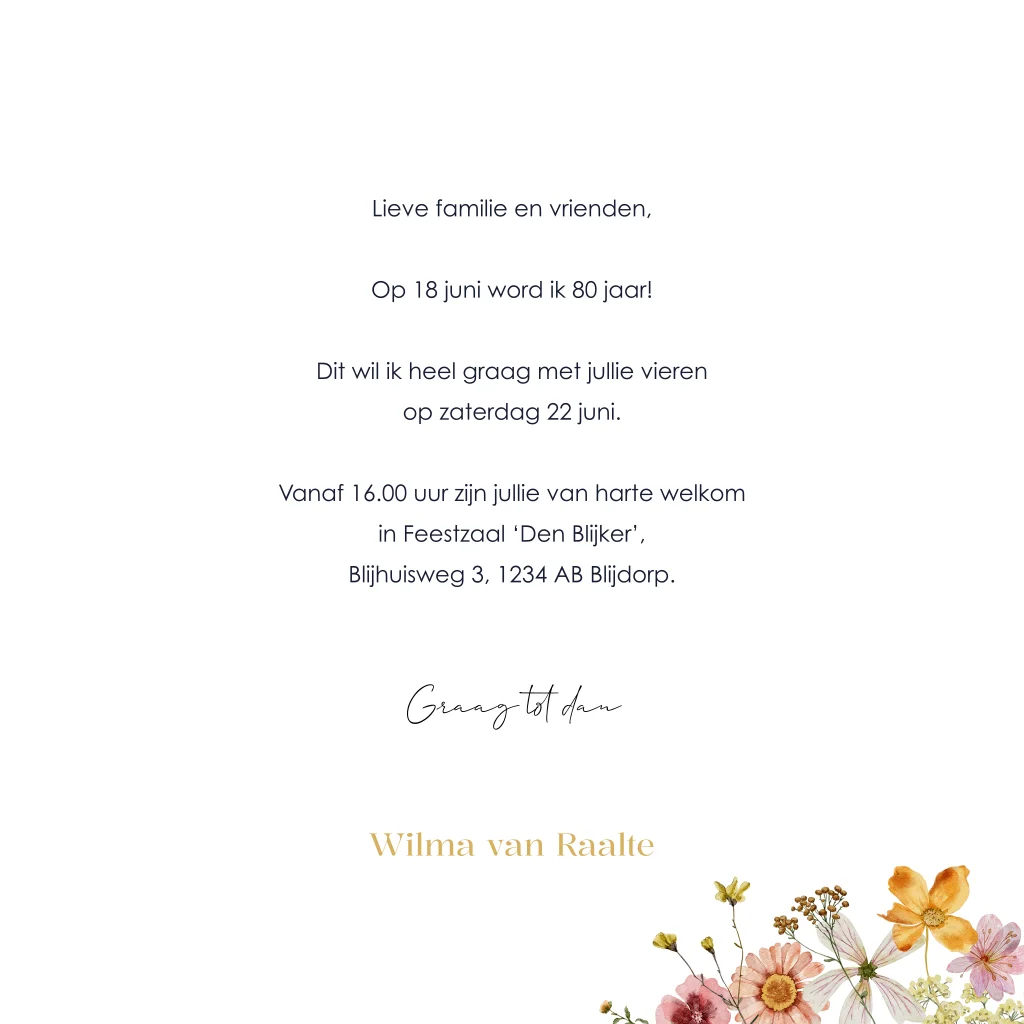 Uitnodiging verjaardag 80 jaar met bloemen in cijfer en luxe folie