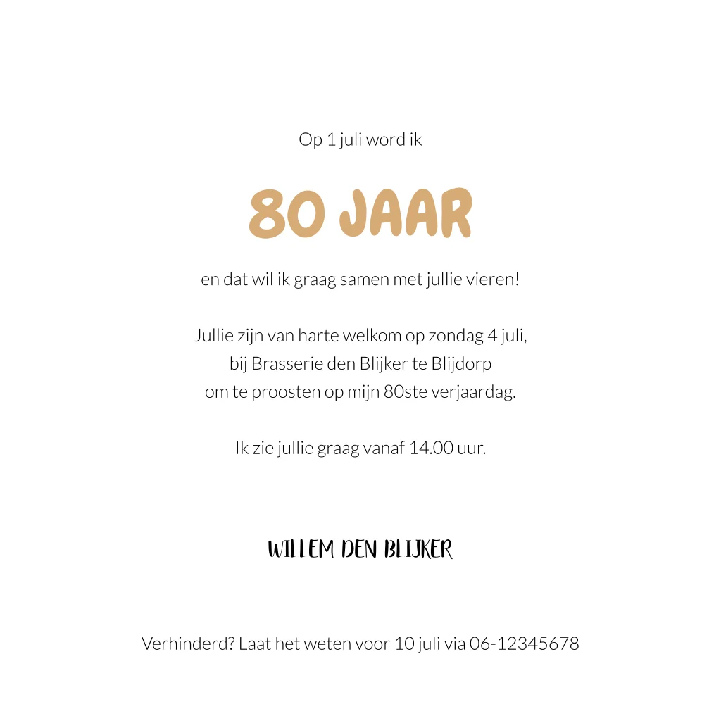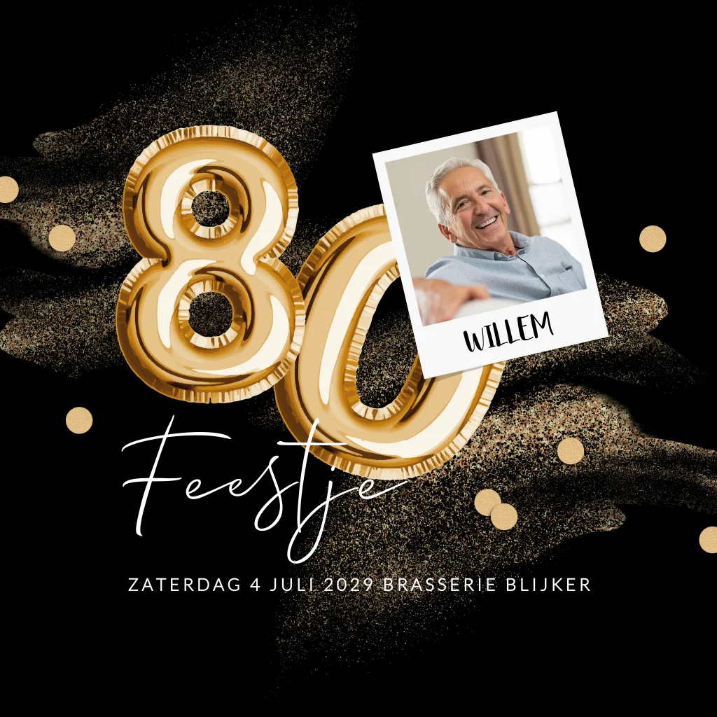 Feestelijke en sprankelende uitnodiging voor een 80ste verjaardag. Met zwarte achtergrond en goudkleurige confetti en teksten in verschillende lettertypes is dit een stijlvolle uitnodiging. De leeftijd 80 jaar is extra groot afgebeeld in mooie gouden folie ballonnen. Zet in het kader een vrolijke foto van jezelf. Met deze kaart krijg je zeker zin in een feestje!