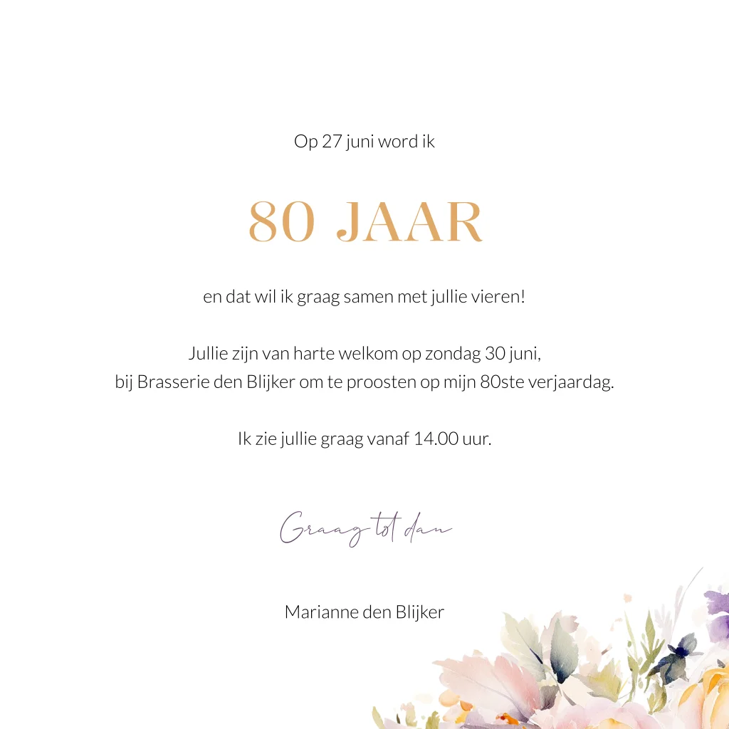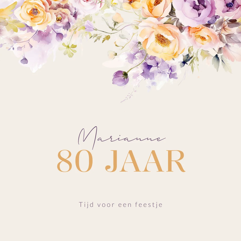 Sierlijke uitnodiging verjaardag 80 jaar met bloemen