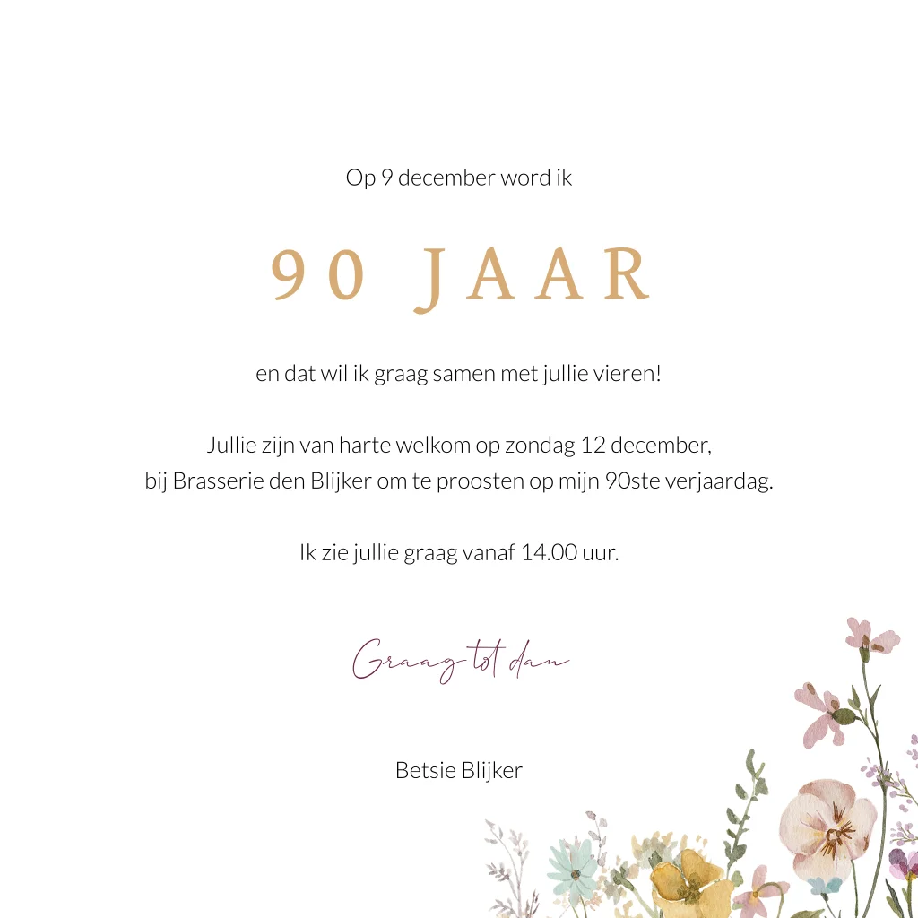 90 jaar verjaardag uitnodiging met aquarel bloemen