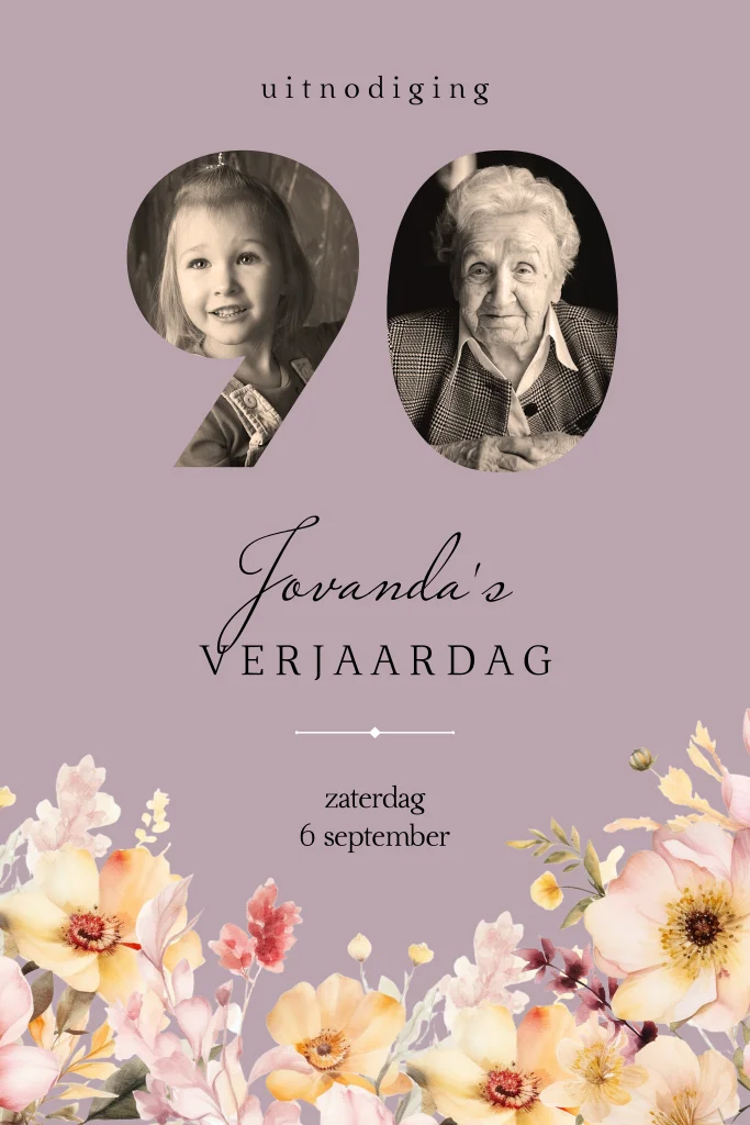Bloemen uitnodiging voor een verjaardag. Deze uitnodiging heeft een mooie paarse achtergrond met vrolijke bloemen. Zet in het cijfer 90 een eigen foto. Hoe leuk om in de 9 een kinderfoto te zetten en in de 0 een recente foto. Pas deze uitnodiging gemakkelijk aan in de online editor. Hulp nodig? We helpen je graag!