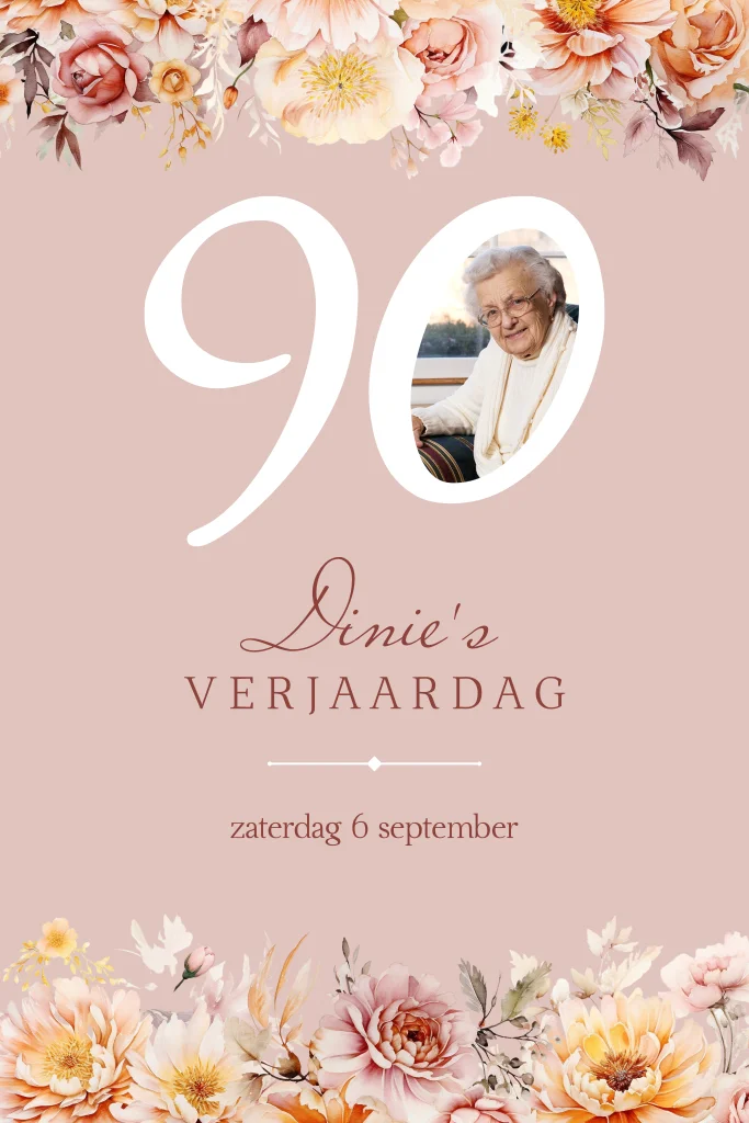 Vrolijke uitnodiging met foto en bloemen voor 90 jaar