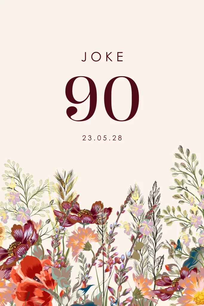 Een kleurrijke en bloemrijke uitnodigingskaart voor het vieren van een 90e verjaardag! Een mijlpaal die zeker gevierd mag worden. Op deze kaart staan mooie kleurrijke bloemen en het getal 90 centraal. Pas deze uitnodiging naar eigen wens aan in onze online editor en maak deze mooie kaart helemaal af met de bijpassende roestbruine envelop.