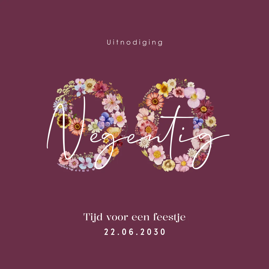 Stijlvolle verjaardag uitnodiging om te vieren dat je 90 jaar wordt of bent geworden. Deze uitnodiging heeft een mooie rood paarse achtergrond met bloemen in het cijfer 90 met daarvoor in goudfolie het woord 'tachtig'. Een chique en toch ook vrolijke uitnodiging voor een 90-jarig verjaardagsfeest. Je kunt deze uitnodiging zelf gemakkelijk bewerken, opslaan en bestellen. Extra handig: Laat je uitnodigingen voor je verjaardagsfeest met onze verzendservice direct vanaf de drukkerij versturen. Vragen of wensen? Laat het gerust weten, wij helpen je graag.