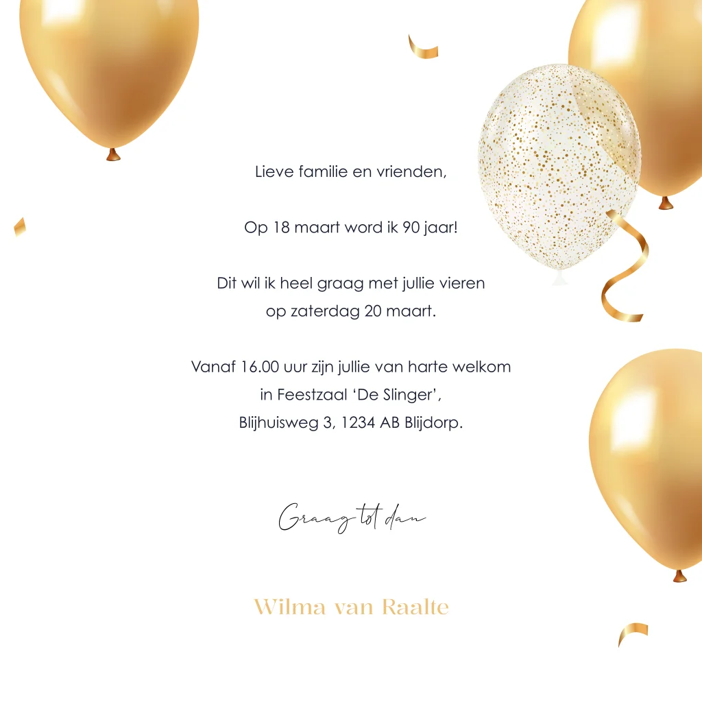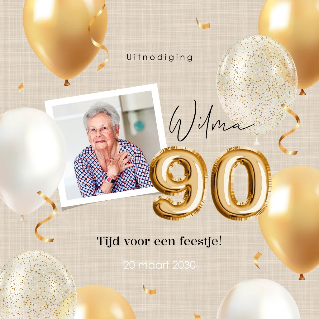 Feestelijke 90 jaar uitnodiging verjaardag met ballonnen en foto