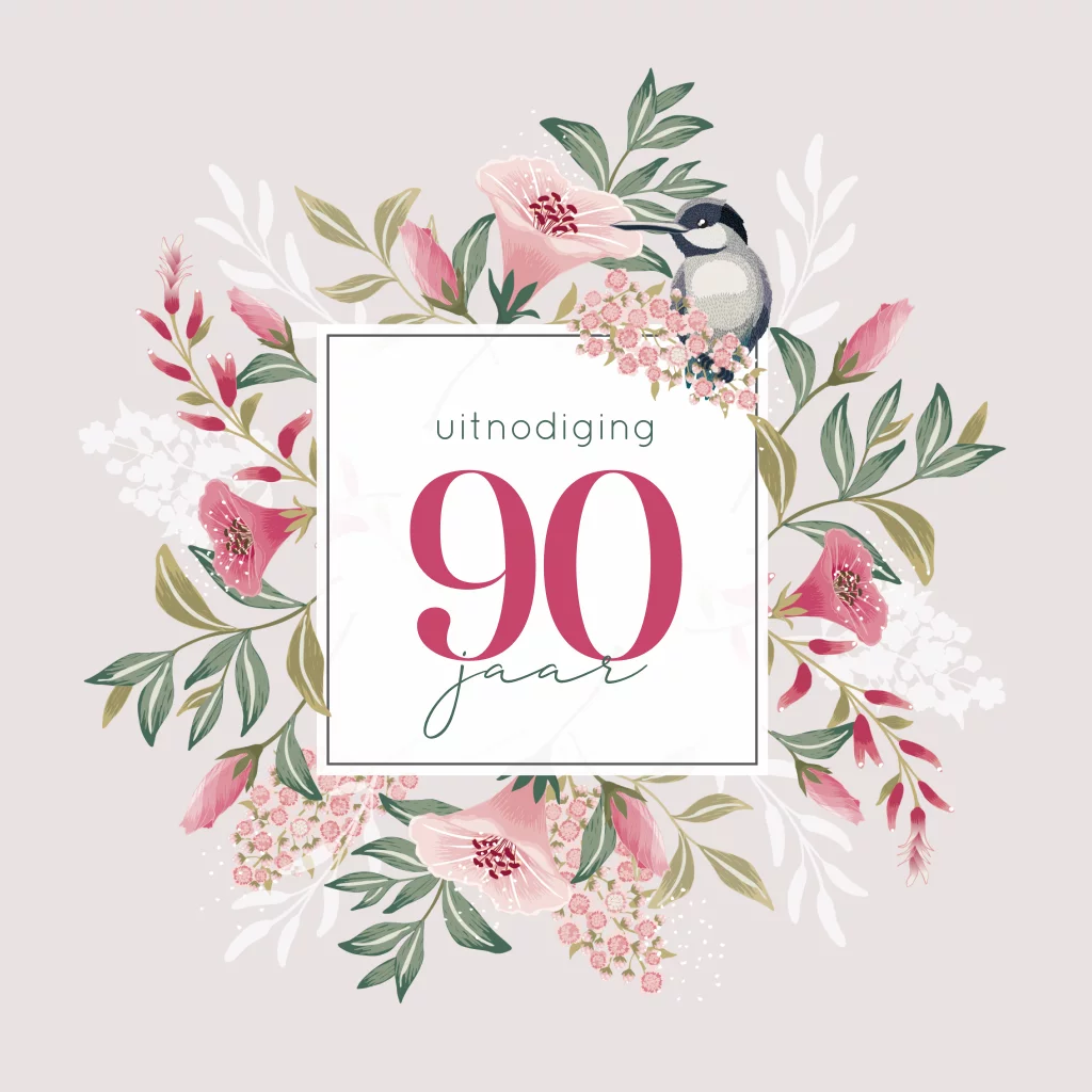 Verjaardag 90 jaar uitnodiging met bloemen, bladeren en een vogel