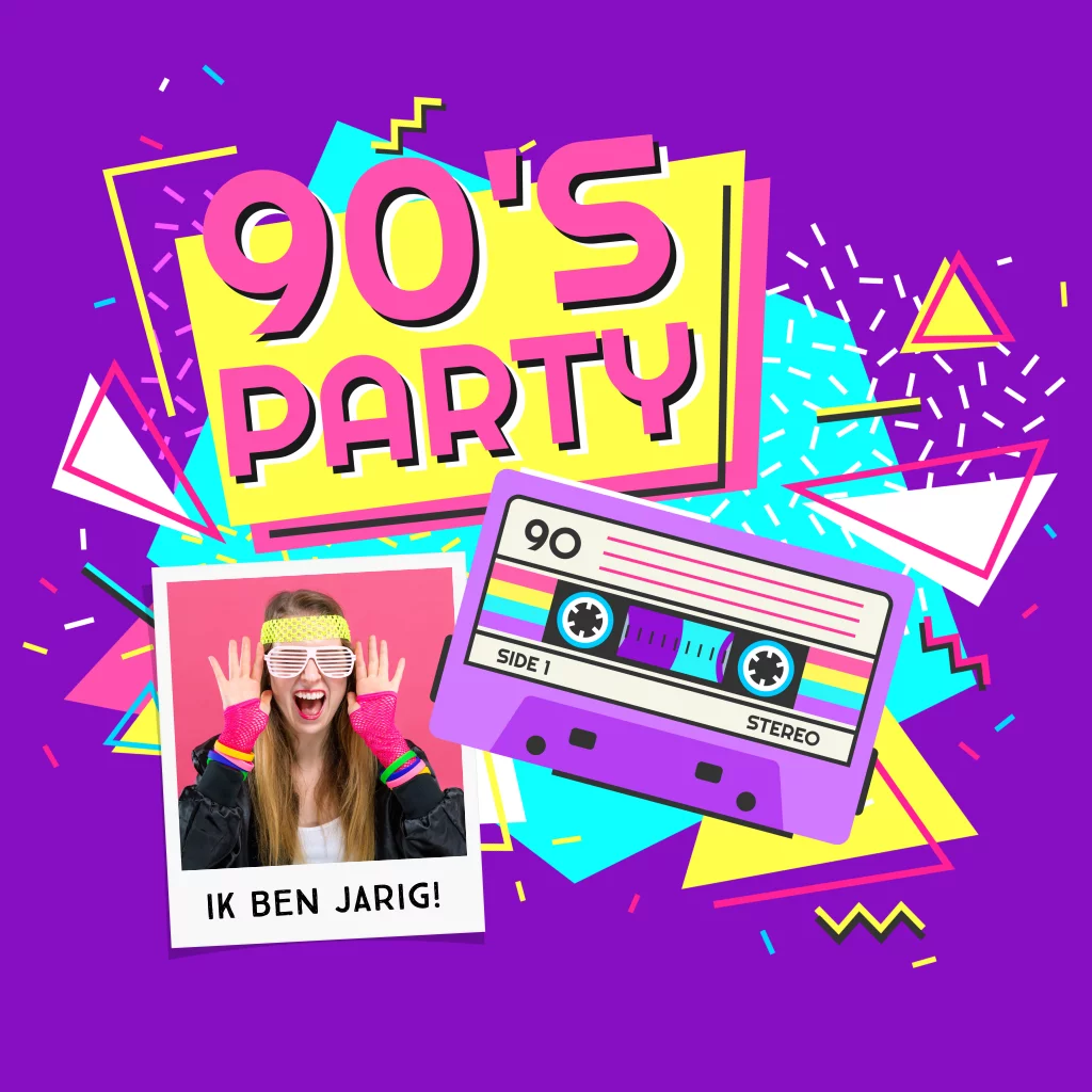 Geboren in de 90's en geef je een feestje? Kies dan voor deze coole uitnodiging met cassettebandje en ruimte voor een eigen foto! Kleuren, lettertypes en afbeeldingen pas je heel eenvoudig zelf aan in onze online editor. Nodig iedereen in stijl uit voor jouw knalfeest!