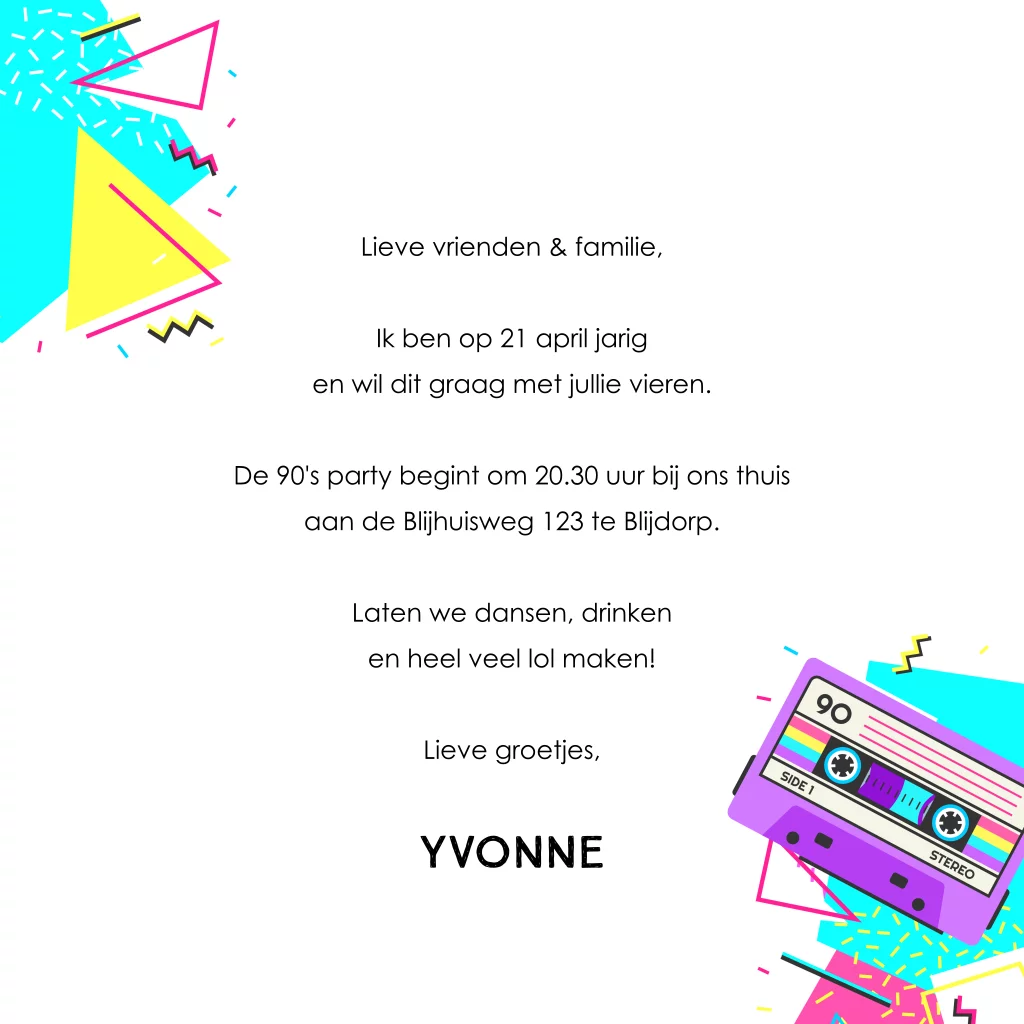 Uitnodiging nineties party cassettebandje met foto