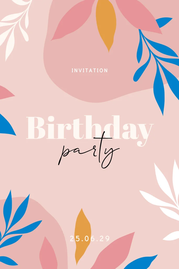 Kleurrijke uitnodigingskaart voor een verjaardagsfeestje. Op deze verjaardagskaart staan gekleurde abstracte bladeren en heeft een pastelroze achtergrond. Nodig je vrienden, familie en kennissen uit voor jouw speciale verjaardag met deze vrolijke uitnodiging.