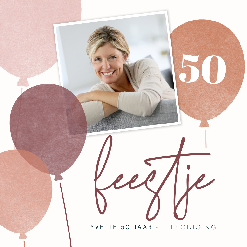 50 geworden en geef je een feestje? Kies dan voor deze feestelijke uitnodigingskaart met roze en terra kleurige ballonnen en eigen foto. Pas de kleuren en lettertypes gemakkelijk aan naar je eigen wensen in de editor.
