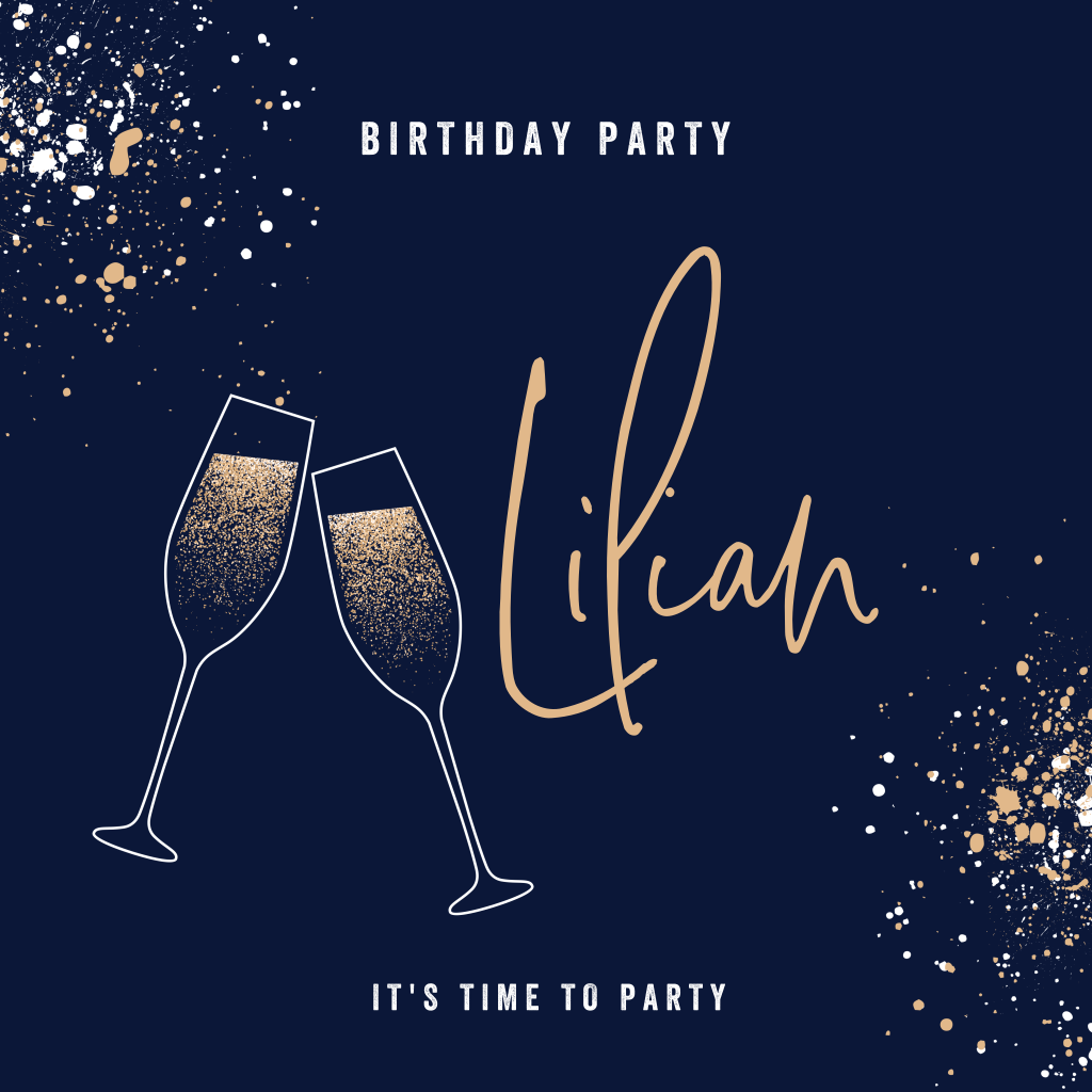 Mooie uitnodigingskaart voor een verjaardag met aan de voorkant champagneglazen. De kaart is wordt extra feestelijk door de gekleurde spetters aan de voor- en achterkant