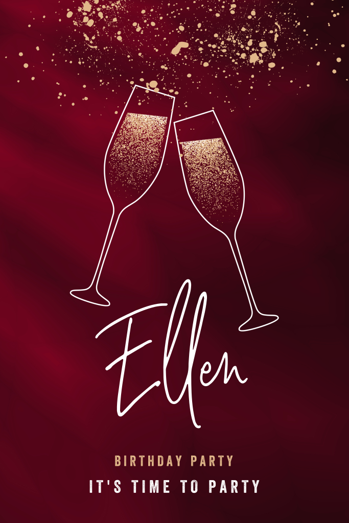 Moderne uitnodiging voor een verjaardag. De achtergrond heeft een mooi bordeaux gloed waardoor de champagne glazen en de tekst goed uitkomen.