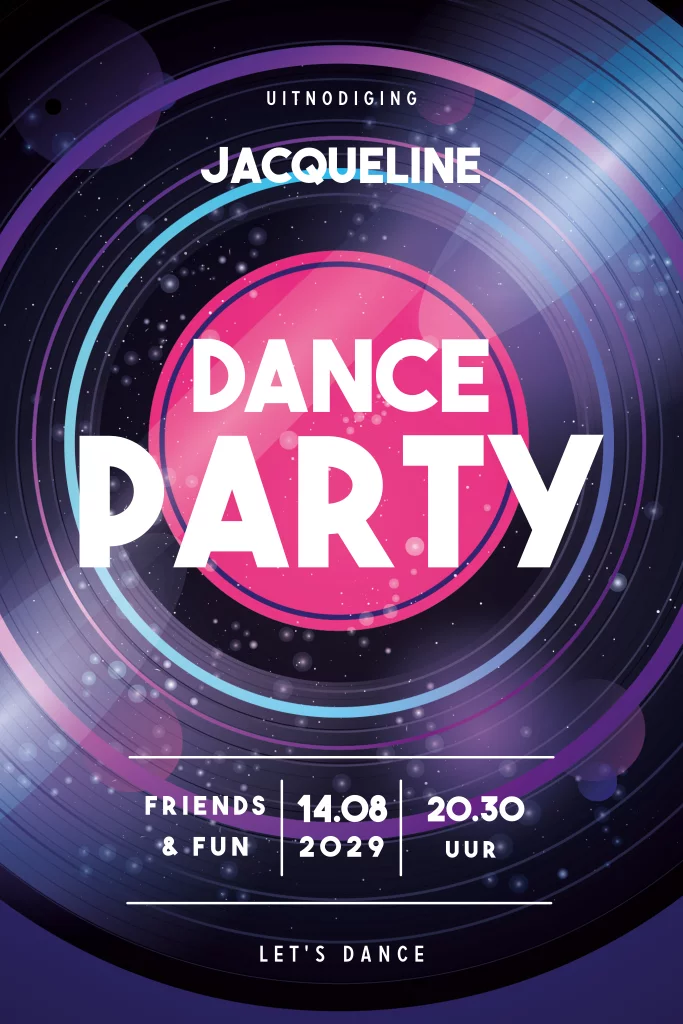 Dance party uitnodiging voor een verjaardag met LP. De kaart heeft afgeronde hoeken. Pas de teksten en kleuren eenvoudig aan in de editor.