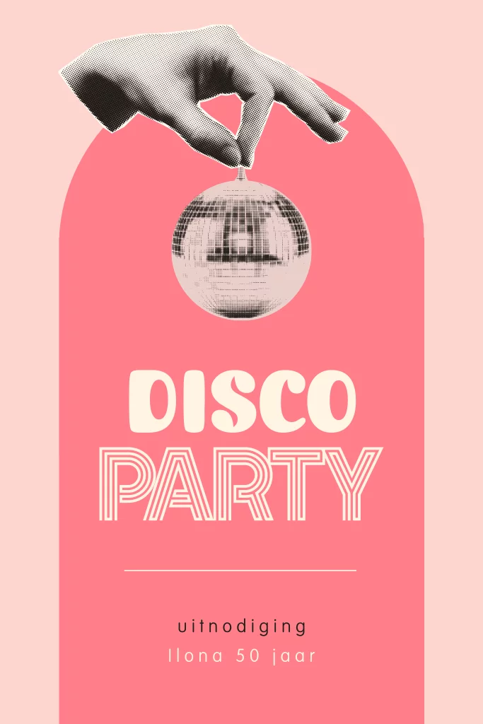 Feestje? Verjaardag? Dan is deze hippe uitnodigingskaart met discobal de perfecte uitnodiging. Of je nu 50 jaar, 40 jaar of 30 jaar wordt of zomaar een feest geeft. Samen proosten en feesten met een discothema daar draait deze uitnodiging om.