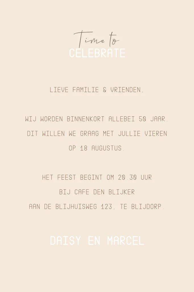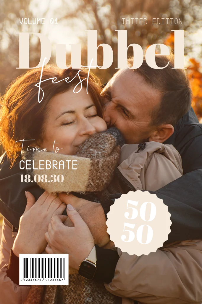Dubbel feest? Vier jullie verjaardagen met deze magazine uitnodigingskaart. Deze hippe kaart heeft ruimte voor een leuke foto van jullie en is afgewerkt met dubbelzijdig foliedruk in een gouden kleur. Door de streepjescode heeft deze uitnodigingskaart een magazine uitstraling, helemaal hip en van nu! Pas deze kaart makkelijk zelf aan.