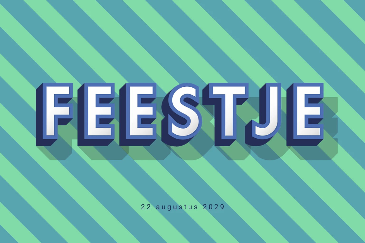 Feestje! Dit kleurrijke kaartje is perfect om je verjaardag mee aan te kondigen. De combinatie van kleurrijke strepen en 3D letters zorgen voor een unieke uitstraling. De donkerblauwe envelop maakt deze uitnodiging helemaal in stijl af.