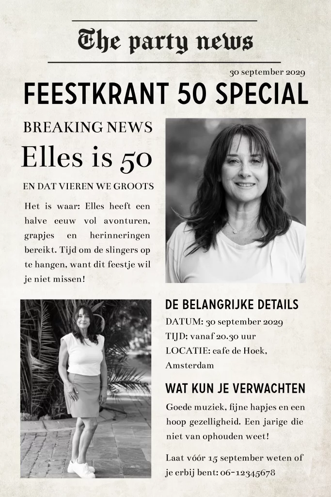 Een typografische uitnodigingskaart 50 jaar verjaardag voor een vrouw. Deze uitnodiging is vormgegeven als een krant. Pas naar eigen smaak de uitnodiging aan in onze online editor en voeg een eigen foto toe. Deze kaart komt het mooiste uit in het formaat 15 x 21 cm. Ontwerp je krant uitnodiging en maak er een onvergetelijke verjaardag van!