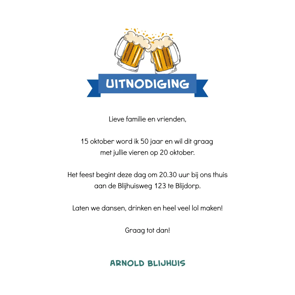 In oktober jarig en houdt je een Oktoberfest feest? Deze verjaardag uitnodiging is geschikt voor een man die 50 jaar wordt en dus Abraham ziet. Een bijzondere mijlpaal die zeker gevierd moet worden! De bierpullen en het Tiroler hoedje passen perfect bij een Oktoberfest. Je kunt alle teksten en kleuren gemakkelijk aanpassen in onze editor.