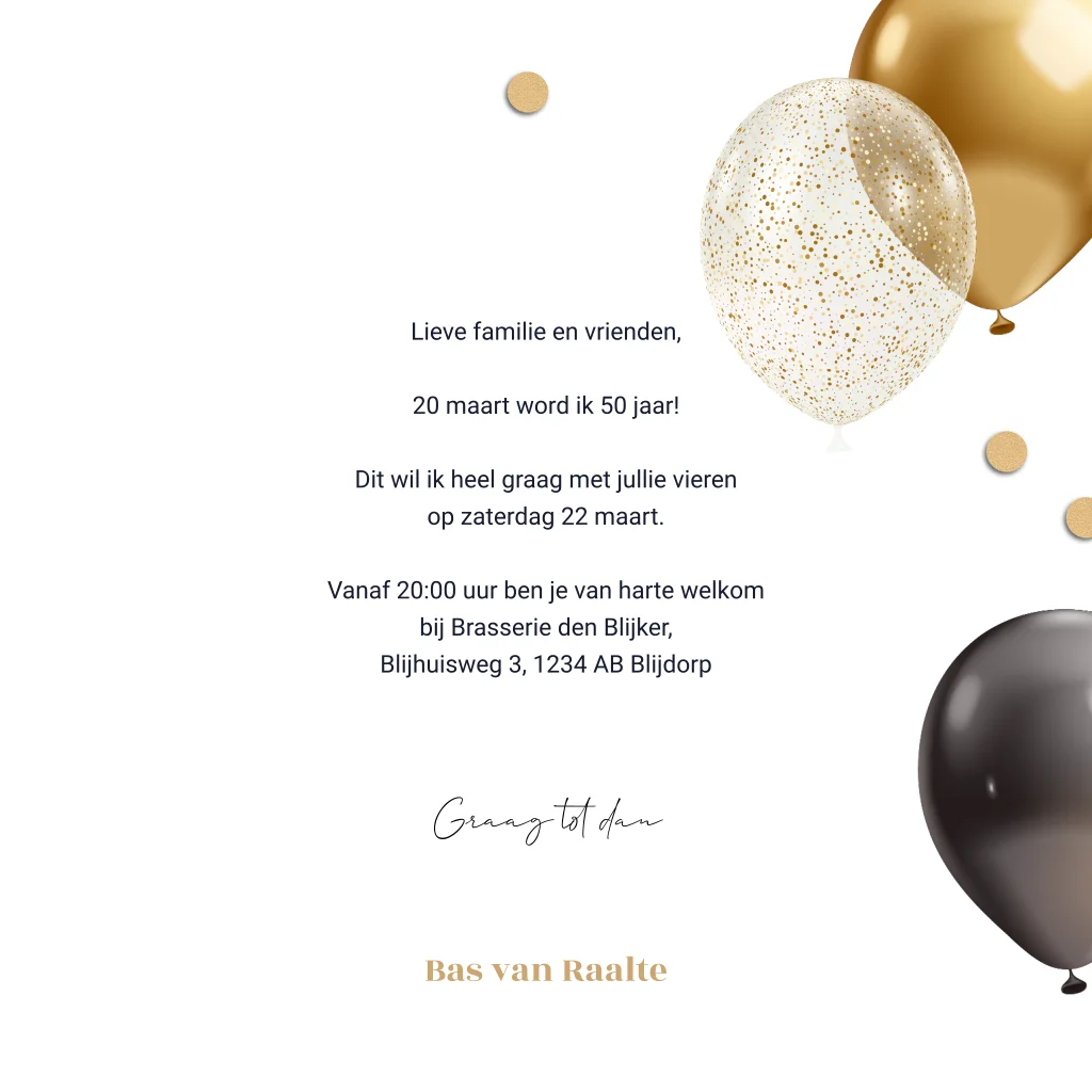 Feestelijke party time uitnodiging voor een verjaardag. Verstuur deze feestelijke uitnodiging om iedereen uit te nodigen. De uitnodiging heeft een beige achtergrond met gouden en zwarte ballonnen en goudlook confetti. Doordat deze uitnodiging voor een verjaardagsfeest neutraal is, is deze geschikt voor alle leeftijden en voor zowel een man als een vrouw.