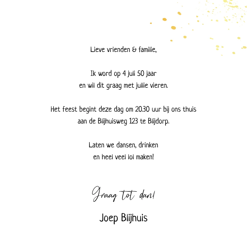 Uitnodiging voor een 50ste verjaardag met eigen foto. Deze verjaardagskaart heeft een witte achtergrond met daarop goud gekleurde spetters en teksten in verschillende lettertypes. Een mooie combinatie. De leeftijd 50 jaar is extra groot afgebeeld. Alle teksten en kleuren zijn gemakkelijk aan te passen in onze editor.