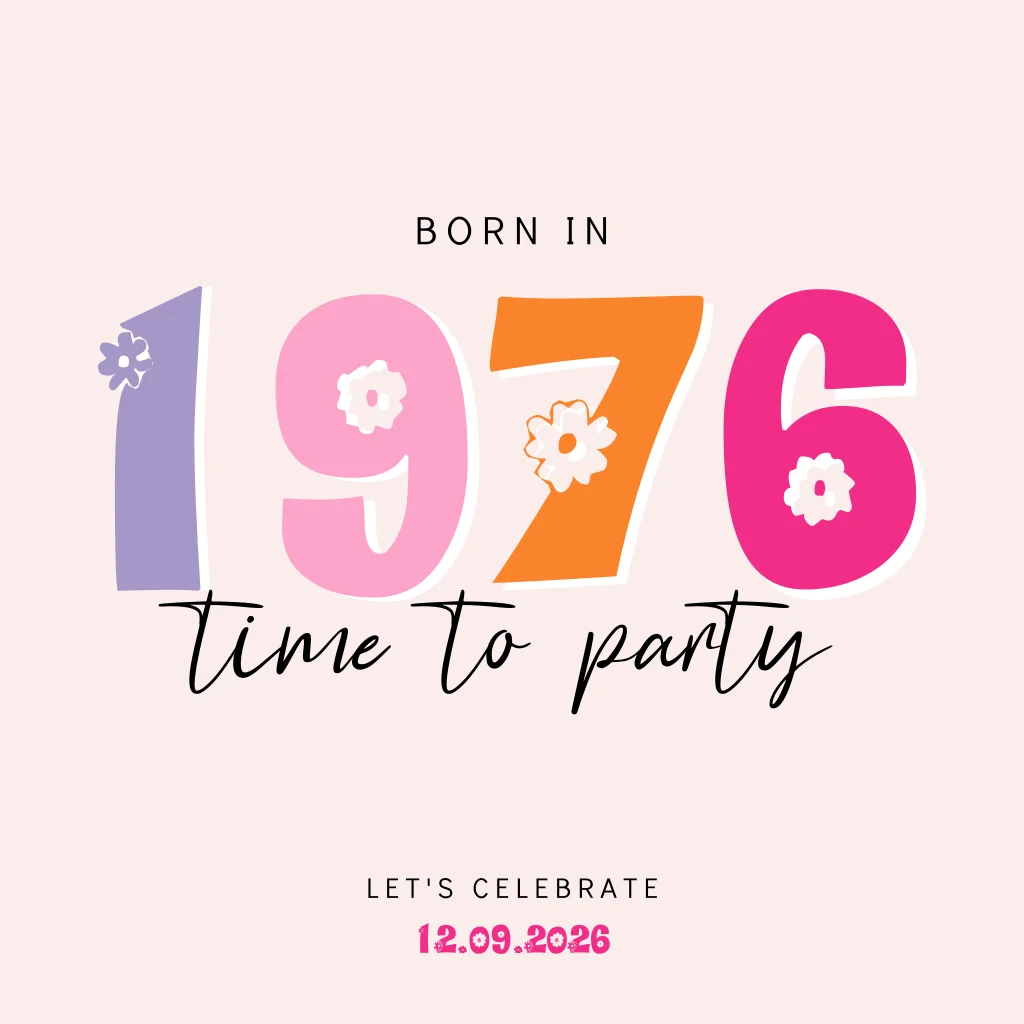 Born in 1976? Time to party! Vier je 50ste verjaardag met deze kleurrijke uitnodigingskaart in Flower Power stijl. Op deze kaart staat het jaartal 1976 in vrolijke groovy kleuren met bloemetjes. De vormen en kleuren geven deze uitnodigingskaart een mooie retro look. Maak de uitnodiging compleet met een gekleurde envelop!