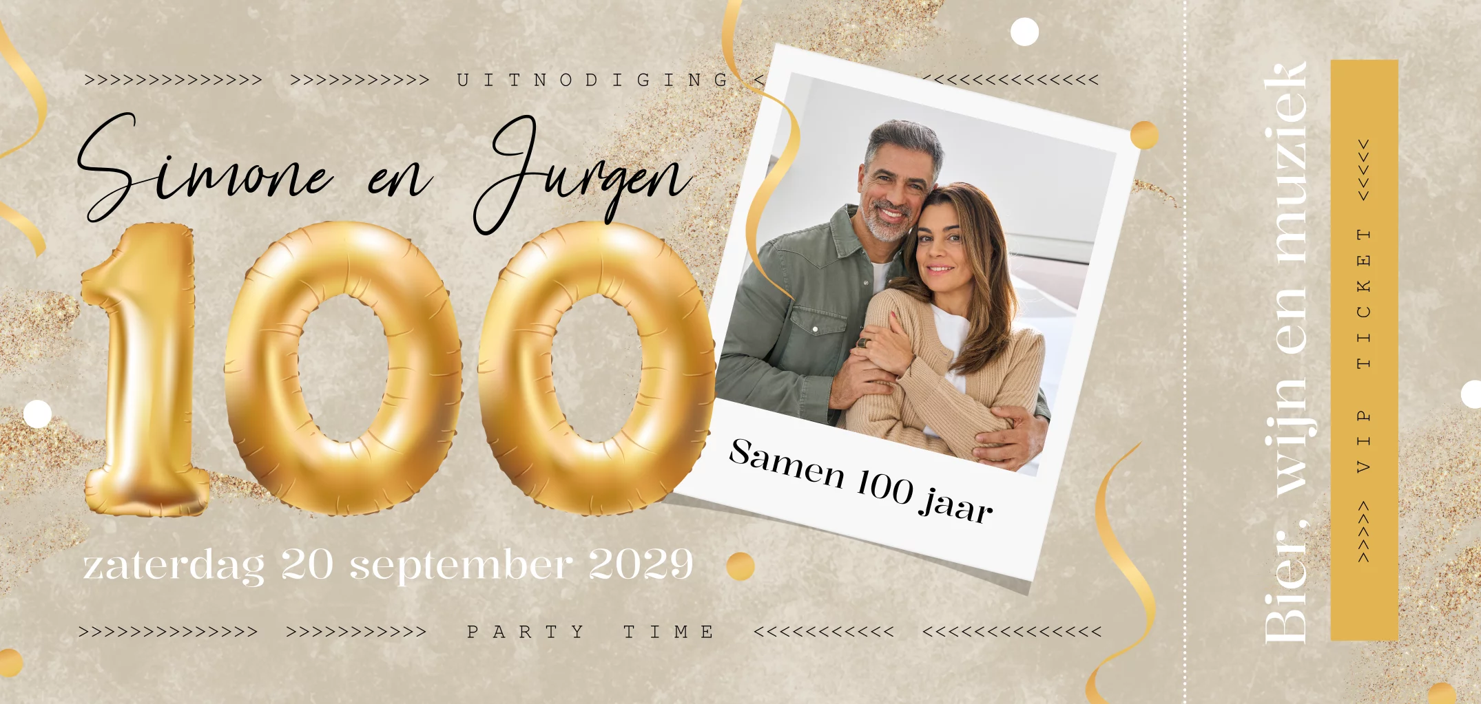 Vier samen een speciale mijlpaal met deze prachtige uitnodiging samen 100! Met een stijlvolle combinatie van een geïllustreerde gouden cijfer ballon en geïllustreerde gouden confetti en glitters zal deze uitnodiging zeker de aandacht trekken van de gasten. Voeg jullie eigen foto toe in onze online editor voor de persoonlijke touch. Bestel deze prachtige ticket uitnodiging en maak van jullie samen 100 feestje een onvergetelijk feest!