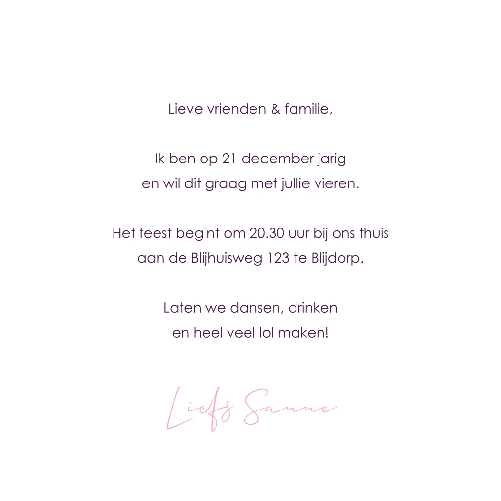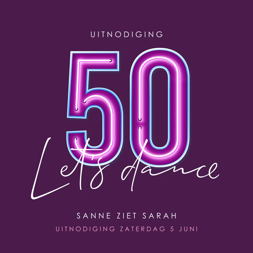 Let´s dance! Retro verjaardagskaart voor een vijftig jarige Sarah met neon cijfers. De paarse 50 cijfers knallen van de kaart door de neonlook. Pas de kaart naar je eigen wensen aan in de editor.