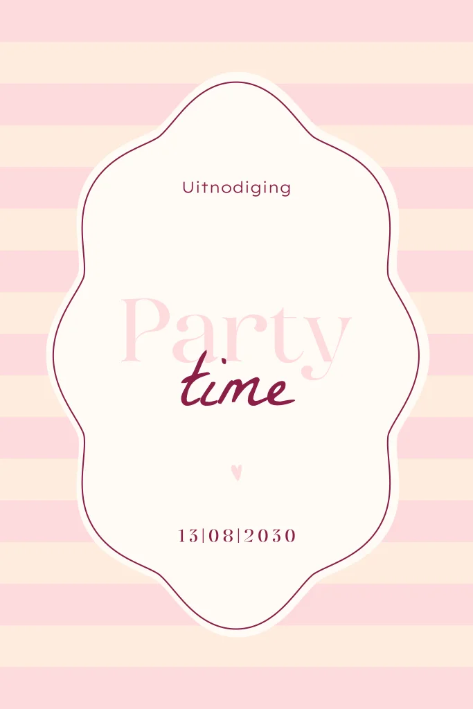 Een pastelkleur uitnodigingskaart voor een verjaardag feestje! Op deze kaart zie je een speels kader met daarin de tekst 'Party time' staan. Om het kader heen zie je een pastelkleur gestreept patroon in roze kleurtinten. Deze uitnodiging is geheel naar eigen smaak aan te passen in onze online editor.