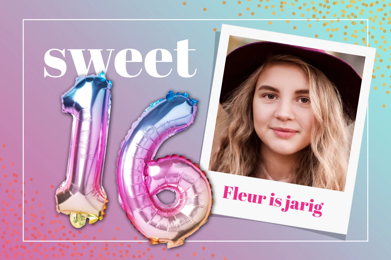 Ballonnen Sweet 16 verjaardag uitnodiging met confetti en eigen foto