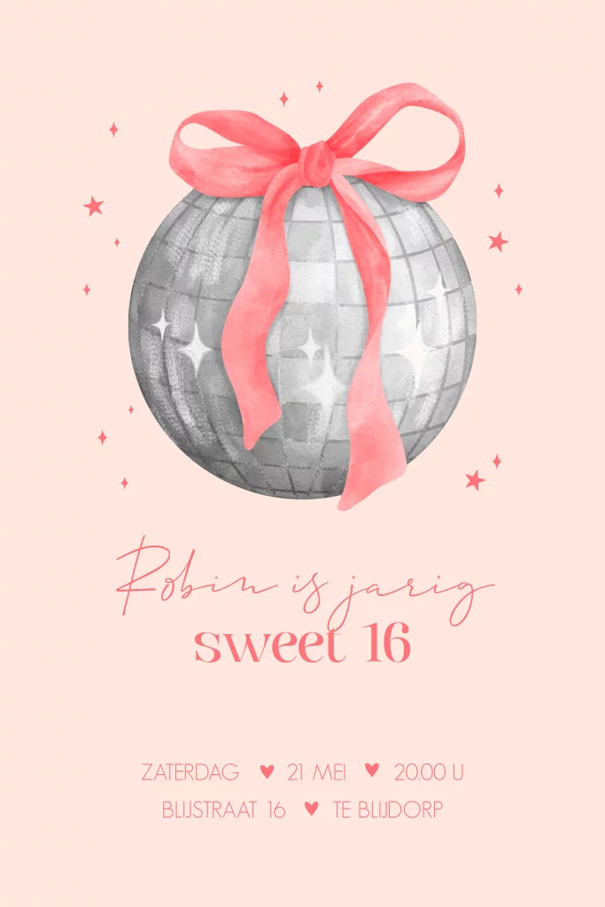 Verjaardag sweet 16 uitnodiging met discobal en strik