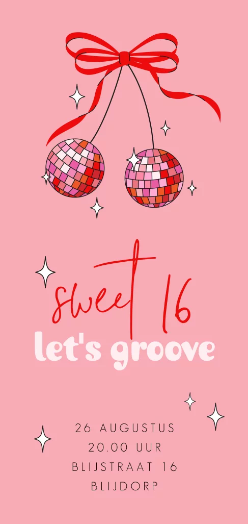 Een prachtige verjaardag uitnodiging voor jouw Sweet 16 feestje. Op deze uitnodiging zie je twee glitterende discoballen met een strik en sterren. Personaliseer deze kaart eenvoudig in onze online editor voor de persoonlijke touch en maak er een onvergetelijk Sweet 16 feestje van!