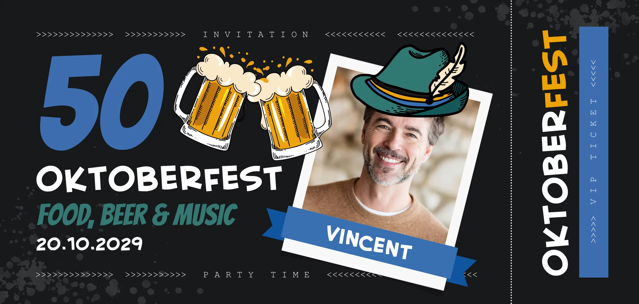 Wordt je 50 jaar en geef je een Oktoberfest feest? Nodig je vrienden en familie uit voor een onvergetelijke 50ste verjaardag met deze uitnodiging in ticketvorm. Zet in het kader een foto van jezelf als jarige Abraham. De bierpullen en het Tiroler hoedje past helemaal in de sferen van het Oktoberfest. Pas de teksten, lettertypes en kleuren gemakkelijk aan in de editor. Hulp nodig? Wij helpen je er graag bij!
