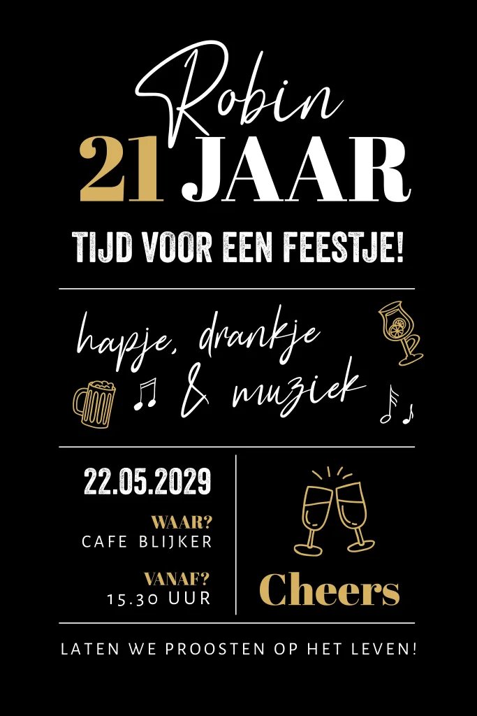 Hippe uitnodigingskaart voor een 21 feestje! Deze kaart is zowel voor een man als vrouw geschikt door de verschillende illustraties, waaronder wijnglazen, bierglas en muzieknoten. Pas deze typografische uitnodiging naar eigen wens aan in de online editor. Hulp nodig? Neem gerust contact met ons op.