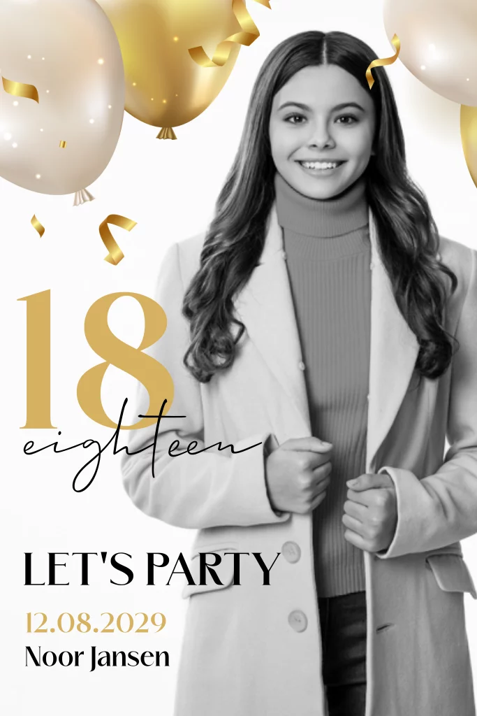 Vier jouw 18e verjaardag met deze prachtige uitnodiging met ballonnen en een eigen foto! De gouden details geven deze kaart een feestelijke uitstraling, perfect voor jouw 18e verjaardagsfeest. De combinatie van geel en goud zorgt voor een modern en speels ontwerp. Voeg jouw eigen foto toe voor een unieke touch aan je uitnodiging. Dit kun je eenvoudig aanpassen in onze online editor. Let's party!