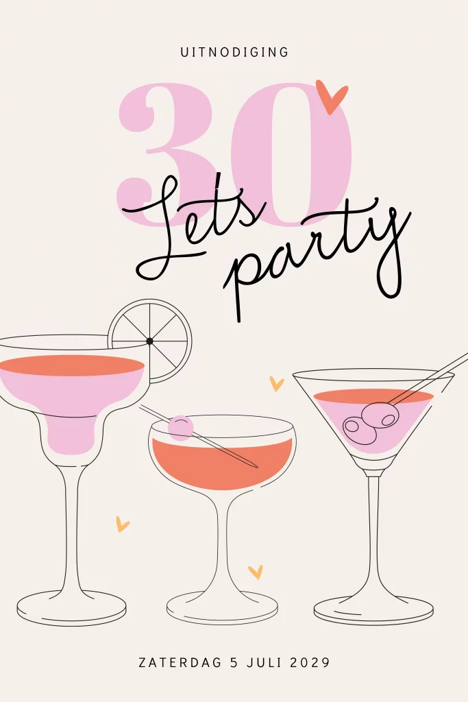 Let's party en vier je 30e verjaardag met deze prachtige uitnodiging! Op deze uitnodiging zie je een aantal cocktails, het nummer 30 en een paar hartjes. Pas deze uitnodiging voor een vrouw naar eigen wens aan en vier je verjaardag!