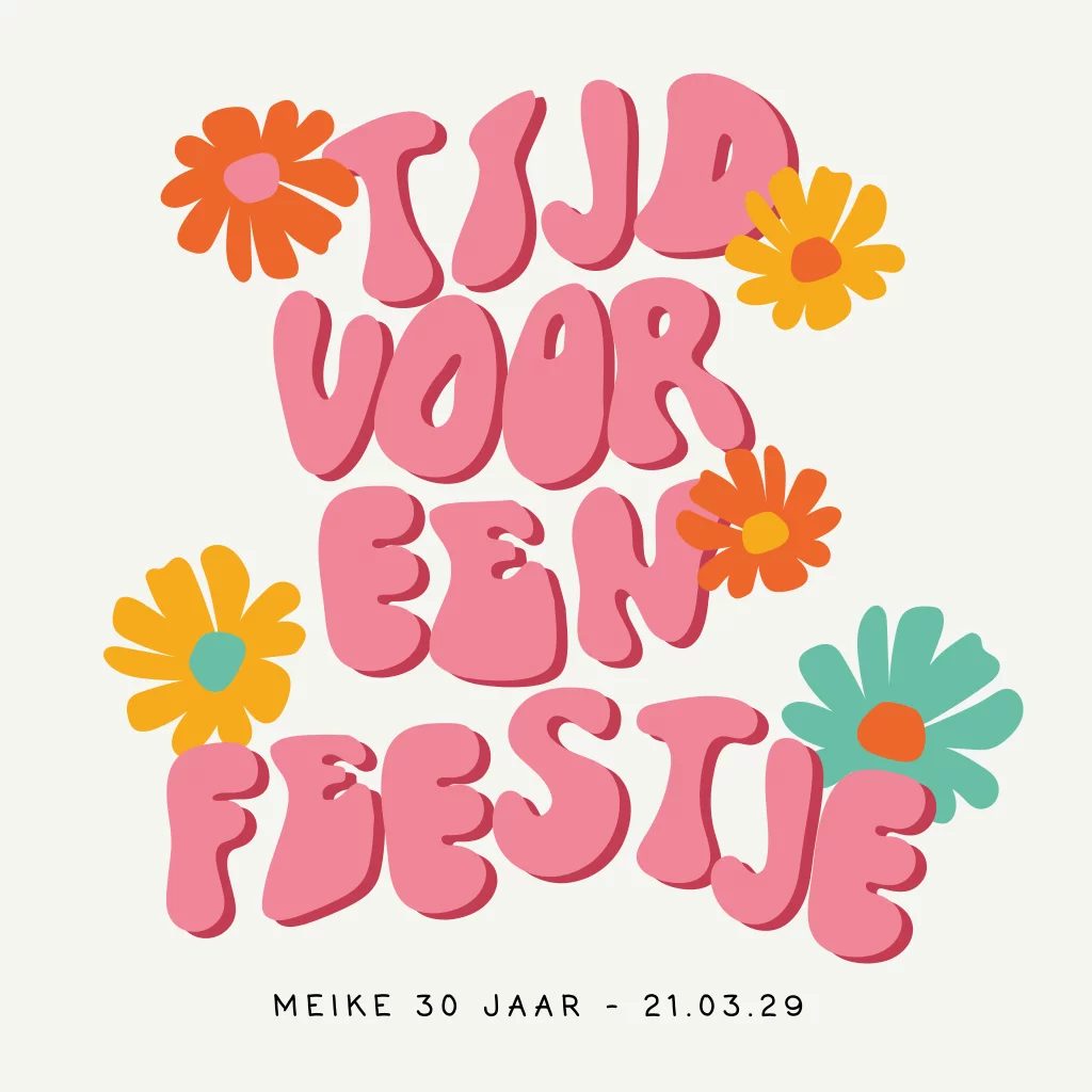 Vrolijke uitnodigingskaart voor een verjaardag met roze letters en gekleurde bloemen in seventies stijl. Het lettertype in combinatie met de verschillende kleuren geven deze kaart een retro look. Pas deze kaart naar je eigen smaak aan in de editor.