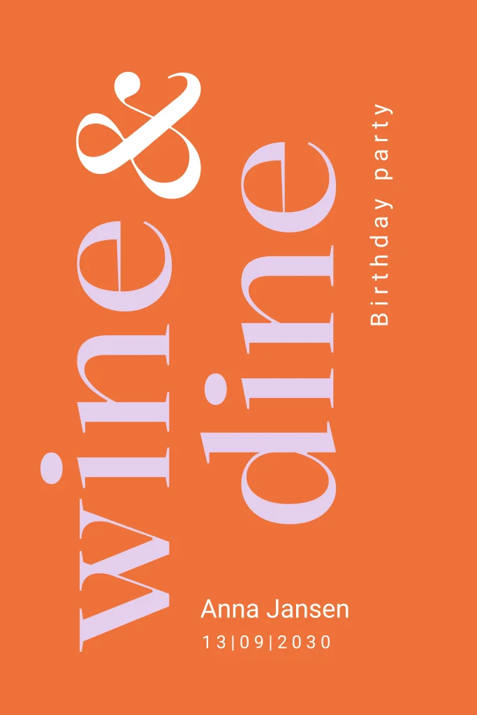 Wine & dine birthday party! Een prachtige uitnodiging met een wine & dine thema met typografische letters. De achtergrond is fel oranje en heeft lila-kleurige letters. Pas deze uitnodiging naar eigen wens aan in onze online editor en nodig je gasten op een stijlvolle manier uit voor jouw wine & dine party.
