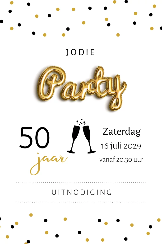 50 jaar uitnodiging met ballonletters en confetti
