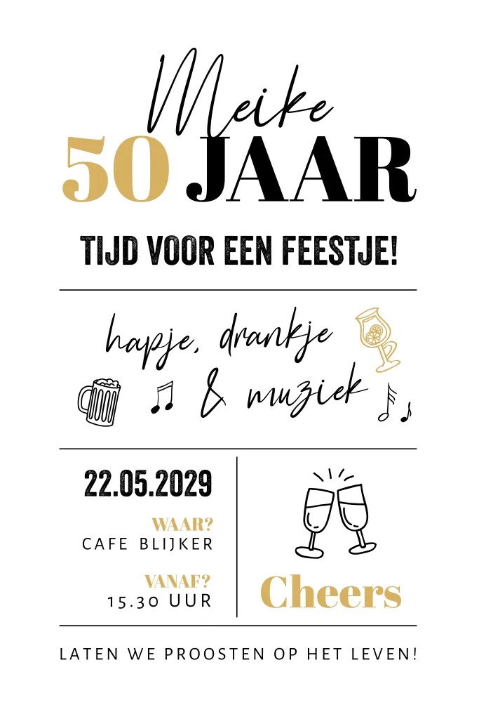 Uitnodiging 50 jaar hip en proost ''tijd voor een feestje''